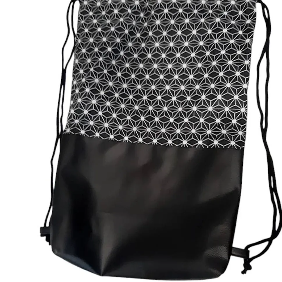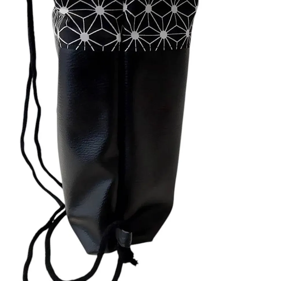 Super geeignet als Rucksack oder Festivaltasche, da er aus einem Robustem Kunstleder und einem festen Baumwollstoff besteht. Am Boden ist der Turnbeutel mit 6cm abgenäht und verleiht der Tasche so mehr Stand.