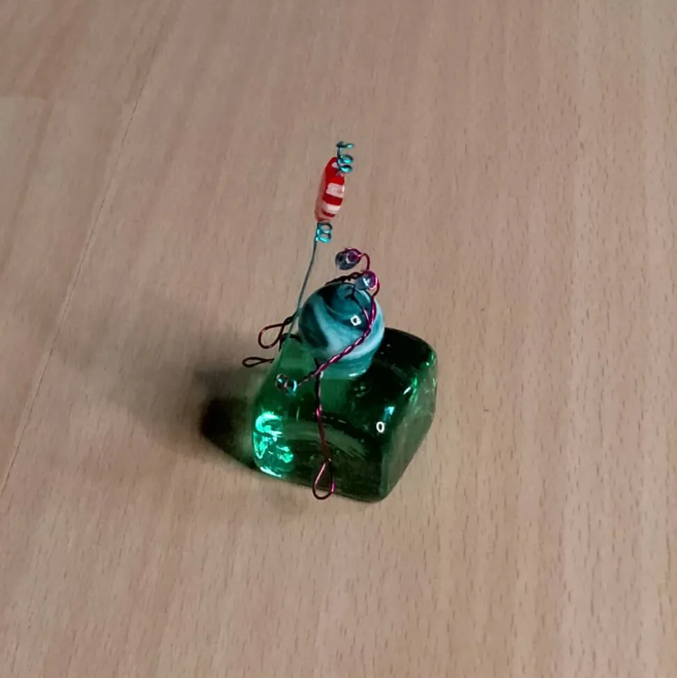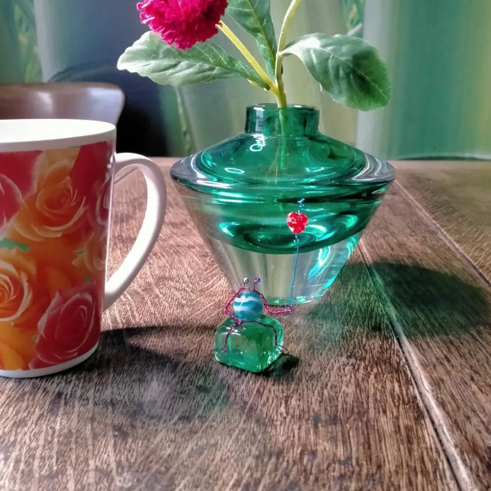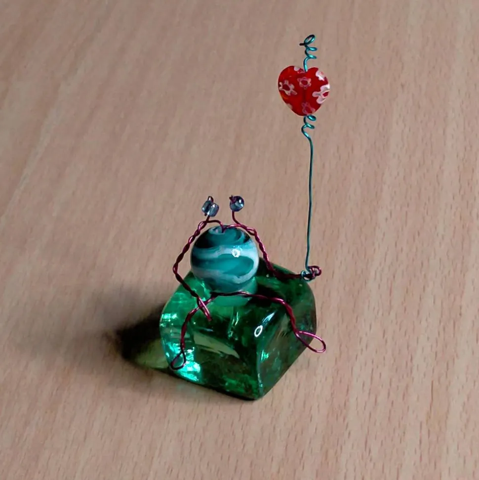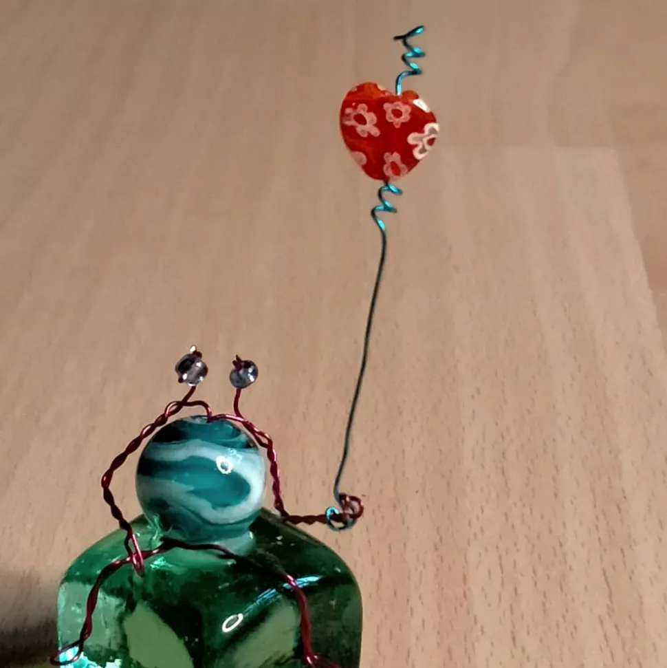 Eine wunderschöne Perle aus Glas ist sein Körper und die Arme und Beine sind aus Draht. Das kleine Herz ist ein Millefiori aus Glas.