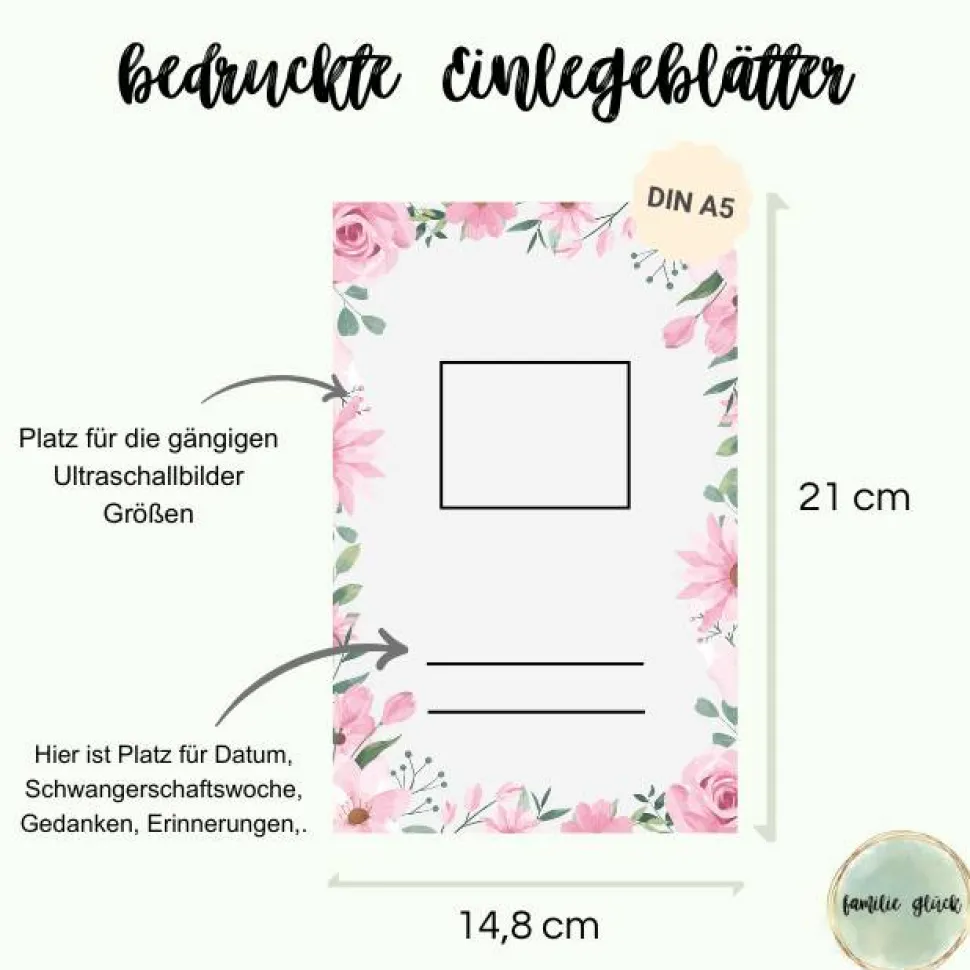 – die Einlegeblätter in den Folien sind im Format DIN A5. Auf dem Vordruck findet ein normales Ultraschallbild der Größe 7x10cm seinen Platz