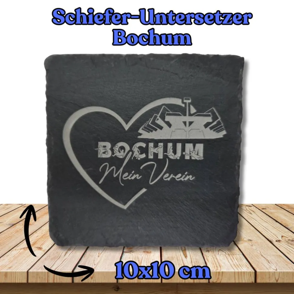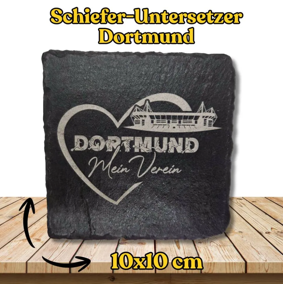 Wähle aus Motiven wie dem Stadium von Dortmund, Gelsenkichen, Mönchengladbach, Bochum, Köln, Bremen oder Hamburg und personalisiere den Schiefer-Untersetzer mit deinem Namen oder dem Namen des Beschenkten. Ideal als Geschenk für runde Geburtstage, Junggesellen- oder Mädelsabende.