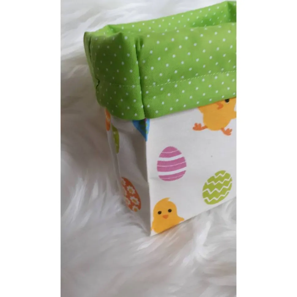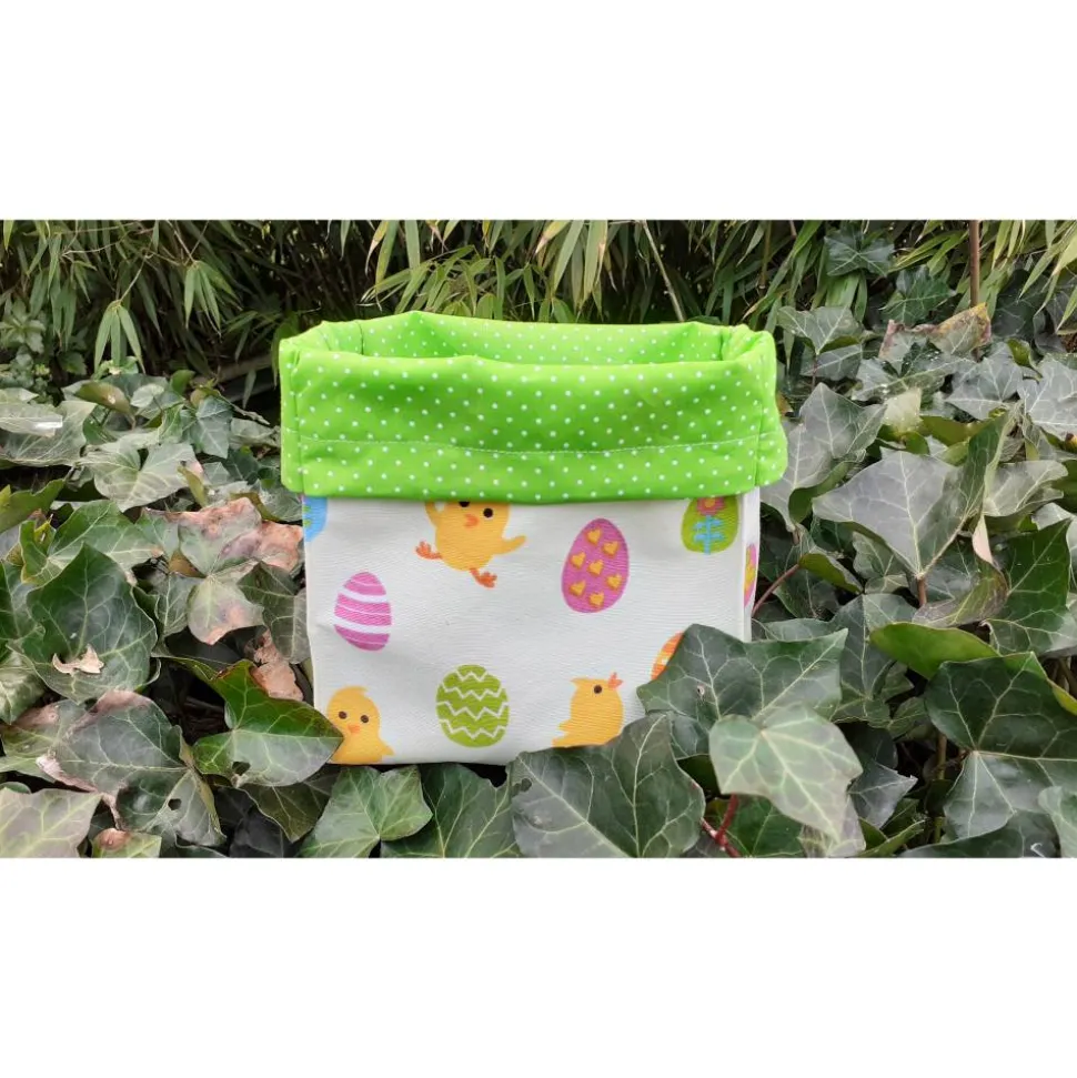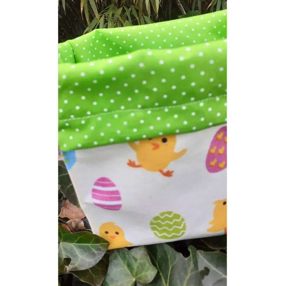 Der Außenstoff ist ein cremeweißer Baumwollstoff, der mit bunten Eiern und witzigen lustigen Küken bedruckt ist. Gefüttert ist es mit einem grünen Baumwollstoff mit weißen Punkten.