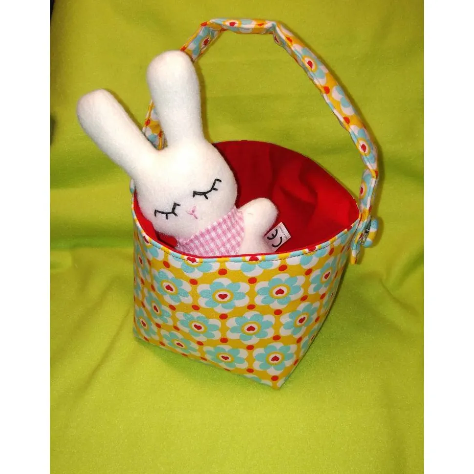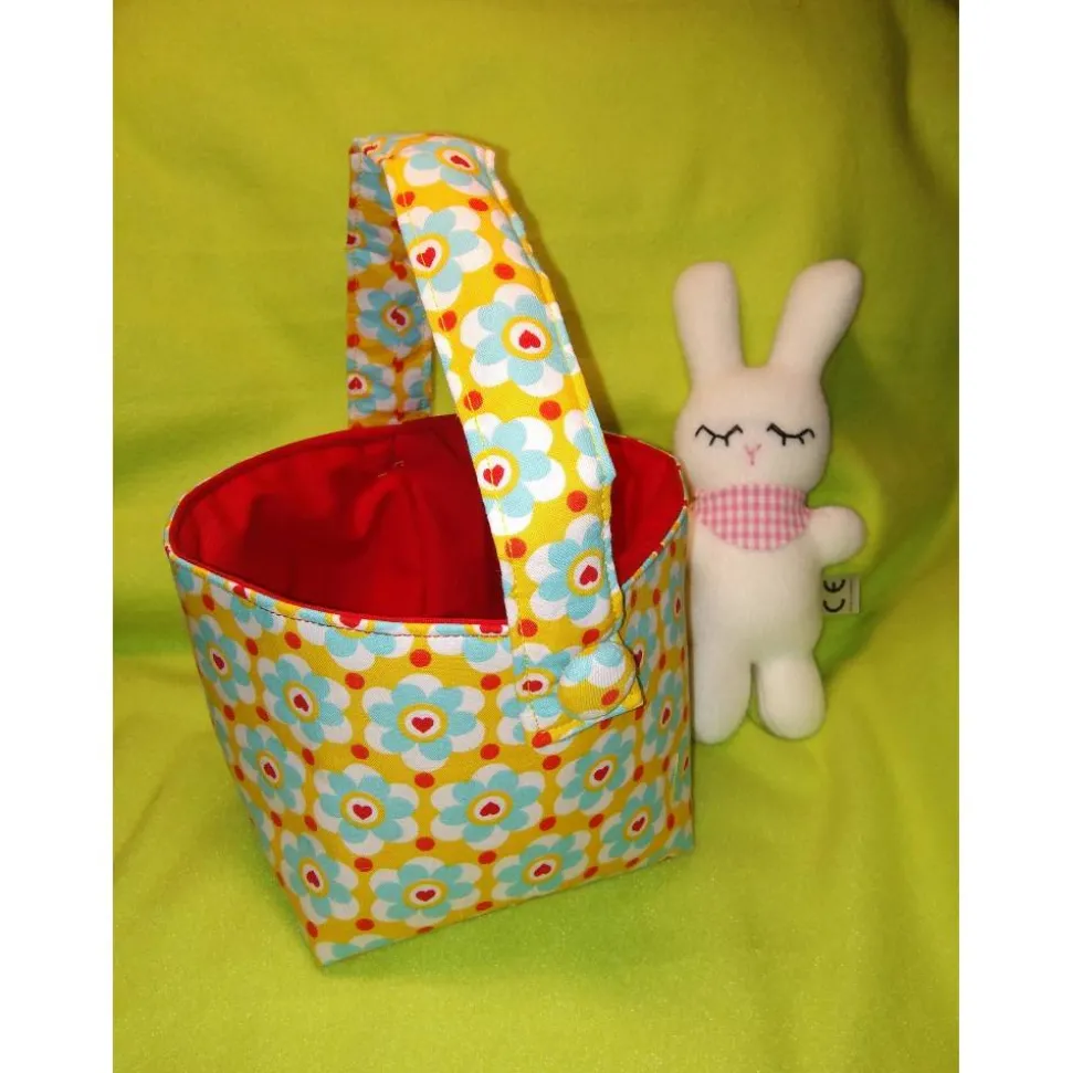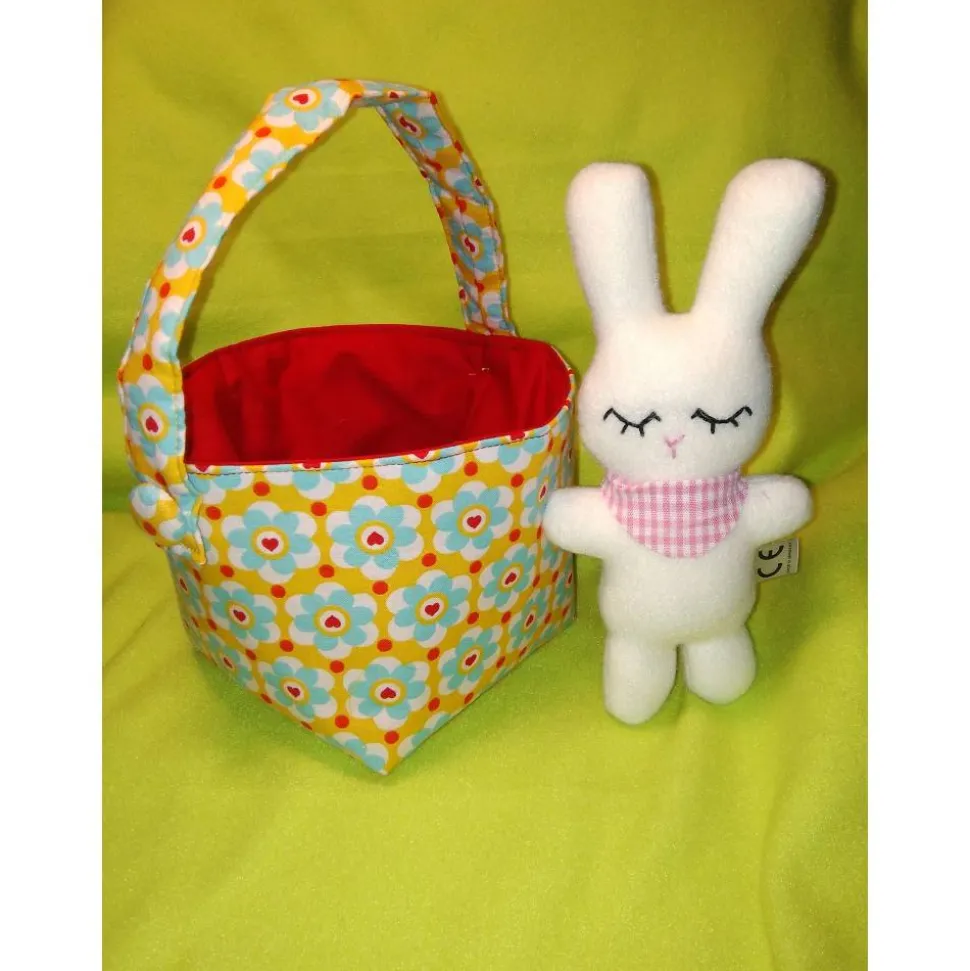 Jetzt kann der Osterhase kommen: Oster-Körbchen aus gemusterten Baumwollstoffen mit Henkel.