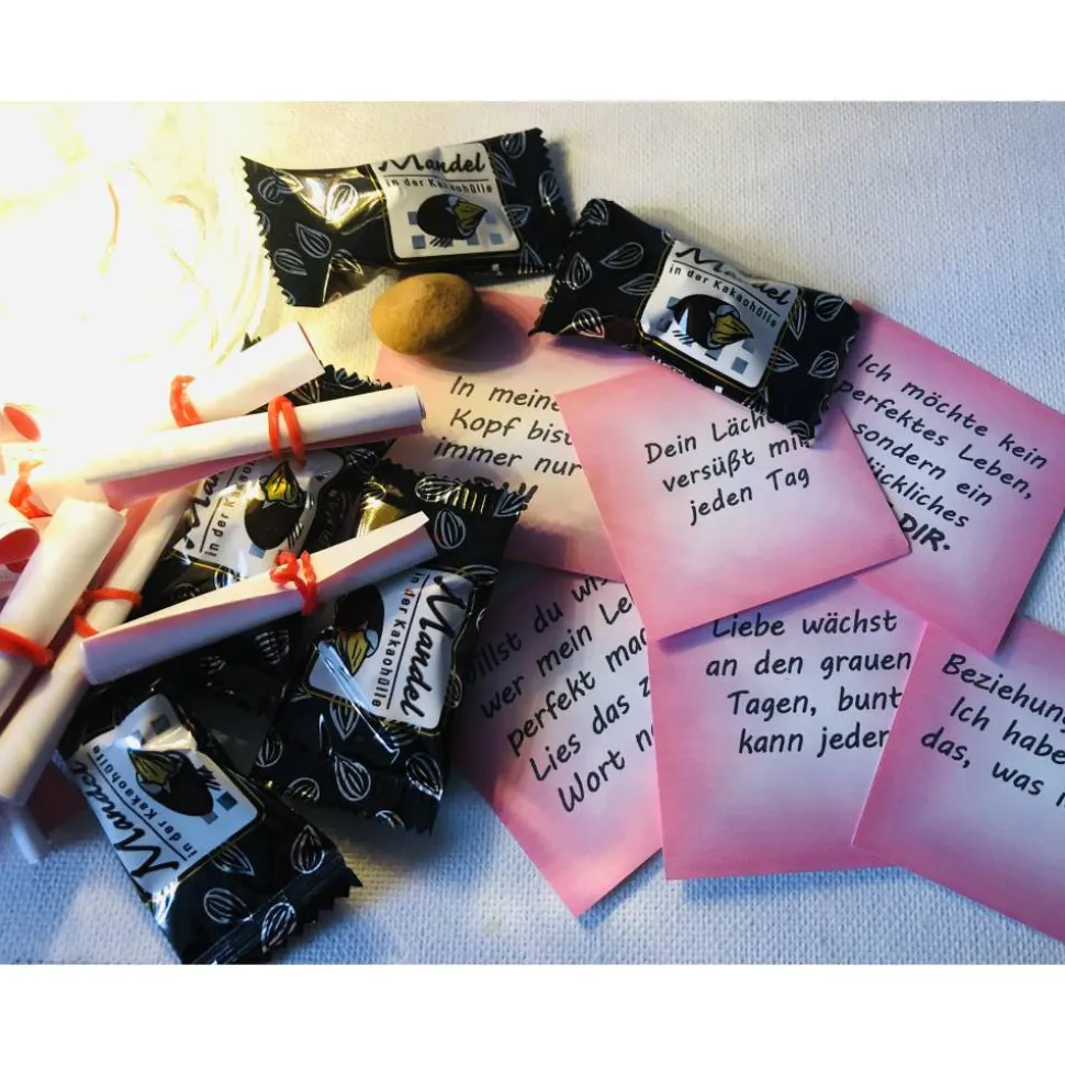 Wenn ihr keinen Namen und auch keinen Inhaltswunsch angebt, dann versende ich die Schokolierten Mandeln und das neutrale Etikett!