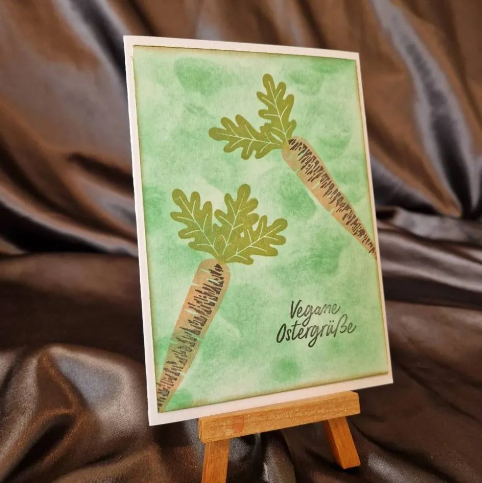 Als Schriftzug wurde der Text “ Vegane Ostergrüße “ gestempelt.