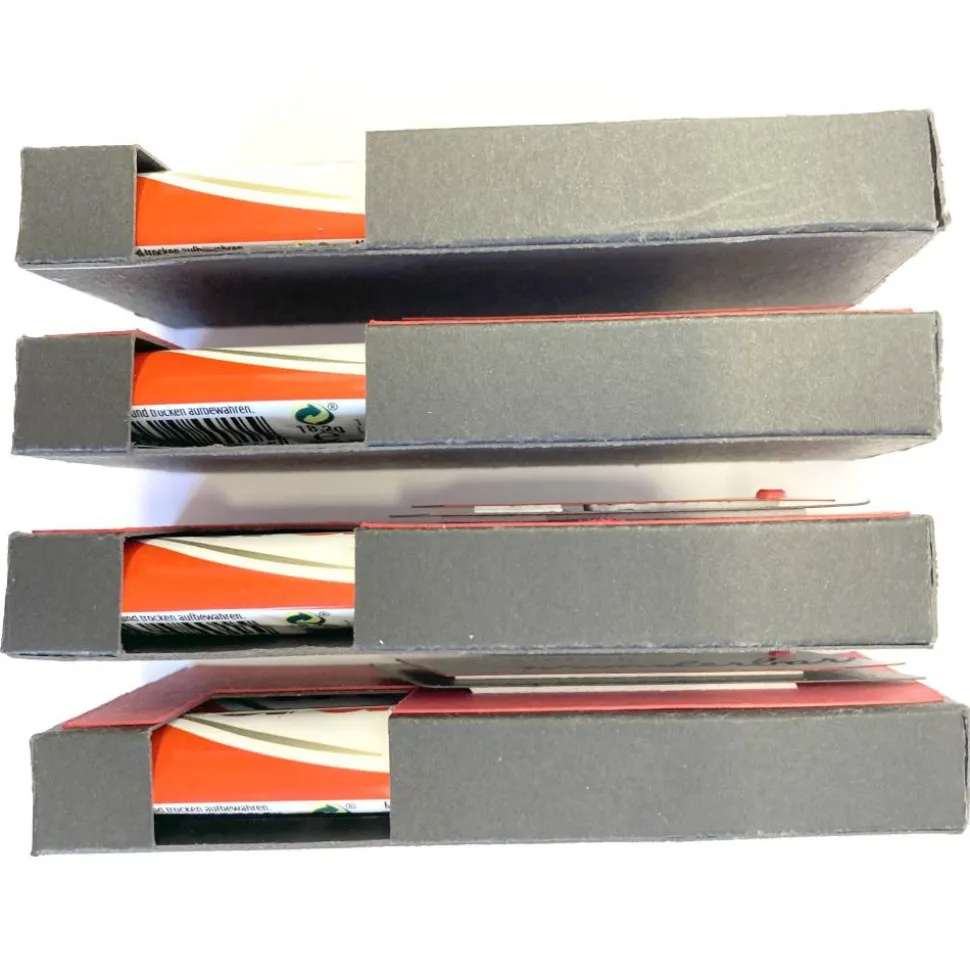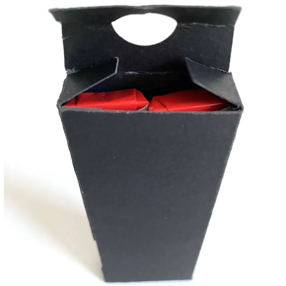 Die Schachteln bestehen aus hochwertigem, schwarzem Tonkarton und sind mit einem roten Aufleger verziert. Sie verfügen an einer Stirnseite über eine praktische Lasche zum Öffnen. Auf Wunsch kannst du einen individuellen Spruch wählen und die Verpackung ganz nach deinen Vorstellungen gestalten lassen.