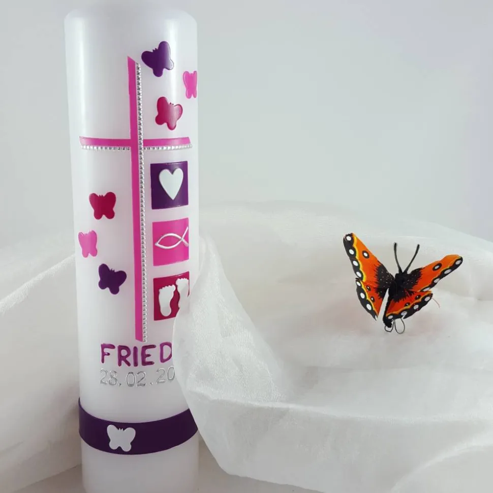 Der Name auf dieser Taufkerze wird mit Wachsmalfarbe geschrieben, für das Datum werden Konturensticker verwendet.