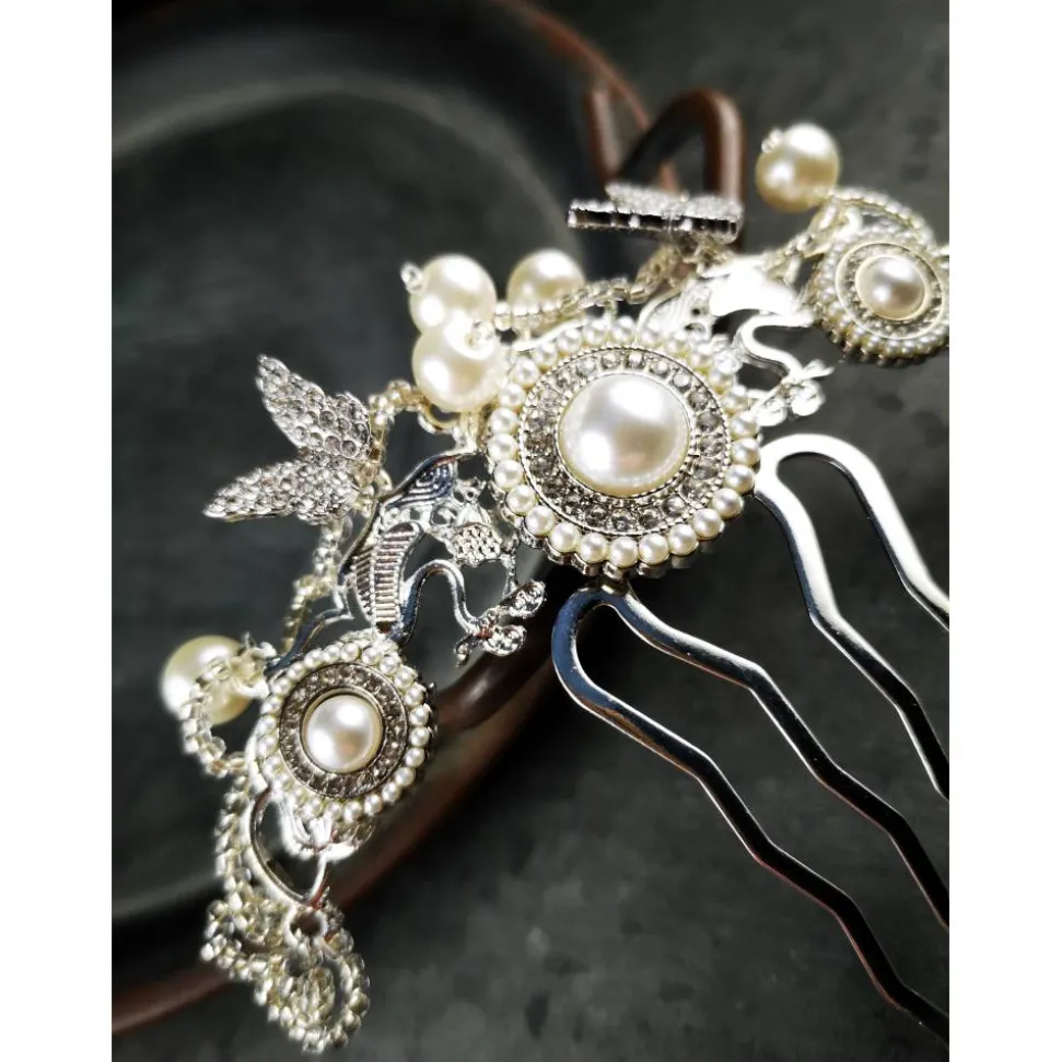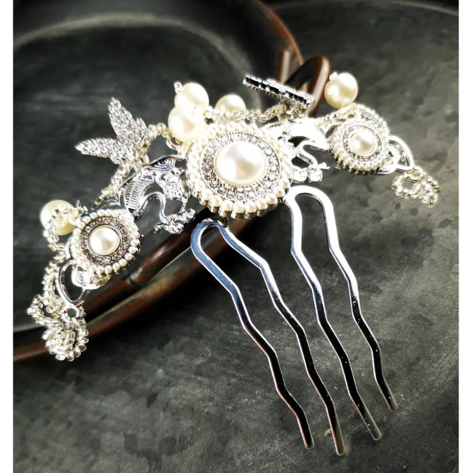 Der Haarkamm wurde mit unterschiedlichen Knöpfen (mit weissen kleinen Acrylperlen und Strass) üppig verziert. Umrandet werden diese mit kleinen, durchsichtigeb Glasperlen, großen weissen Glasperlen und Strasschmetterlingen.