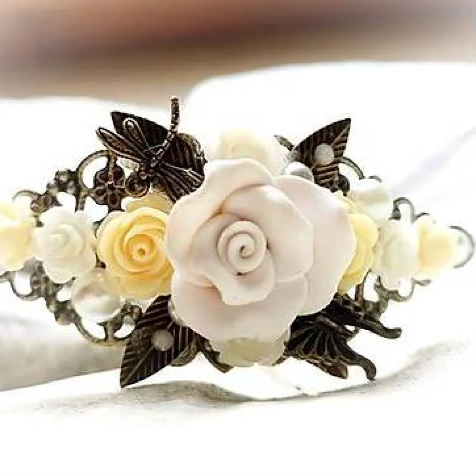 Dieser handgefertigte Haarreif im Antik-Stil ist liebevoll verziert mit Blumen, Cabochons und Metallelementen, die ihm einen nostalgischen Charme verleihen.