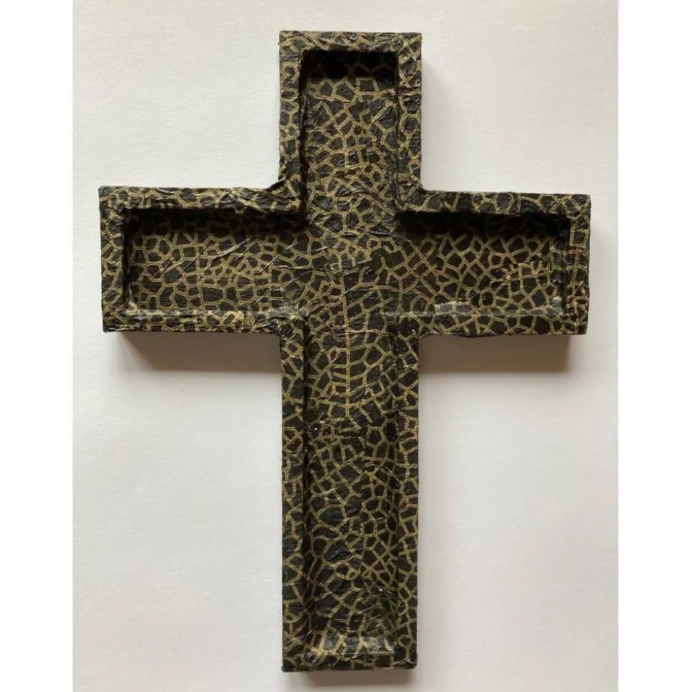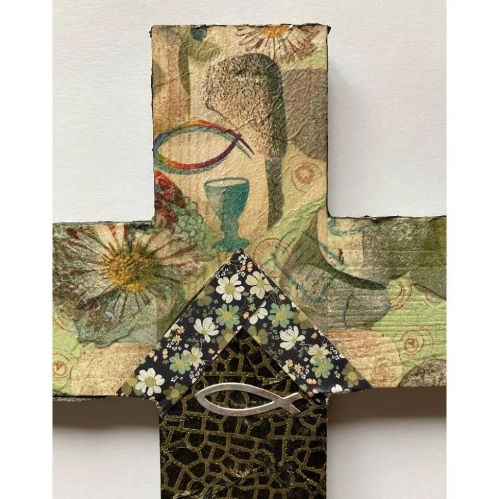 Das fertig-gestaltete Kreuz ist durch den verwendeten Kleber und Lack versiegelt, so dass keine Feuchtigkeit ins Papier eindringen kann. Zusätzliches Schmuckelement ist ein kleiner silberfarbener Fisch als Symbol für den christlichen Glauben.