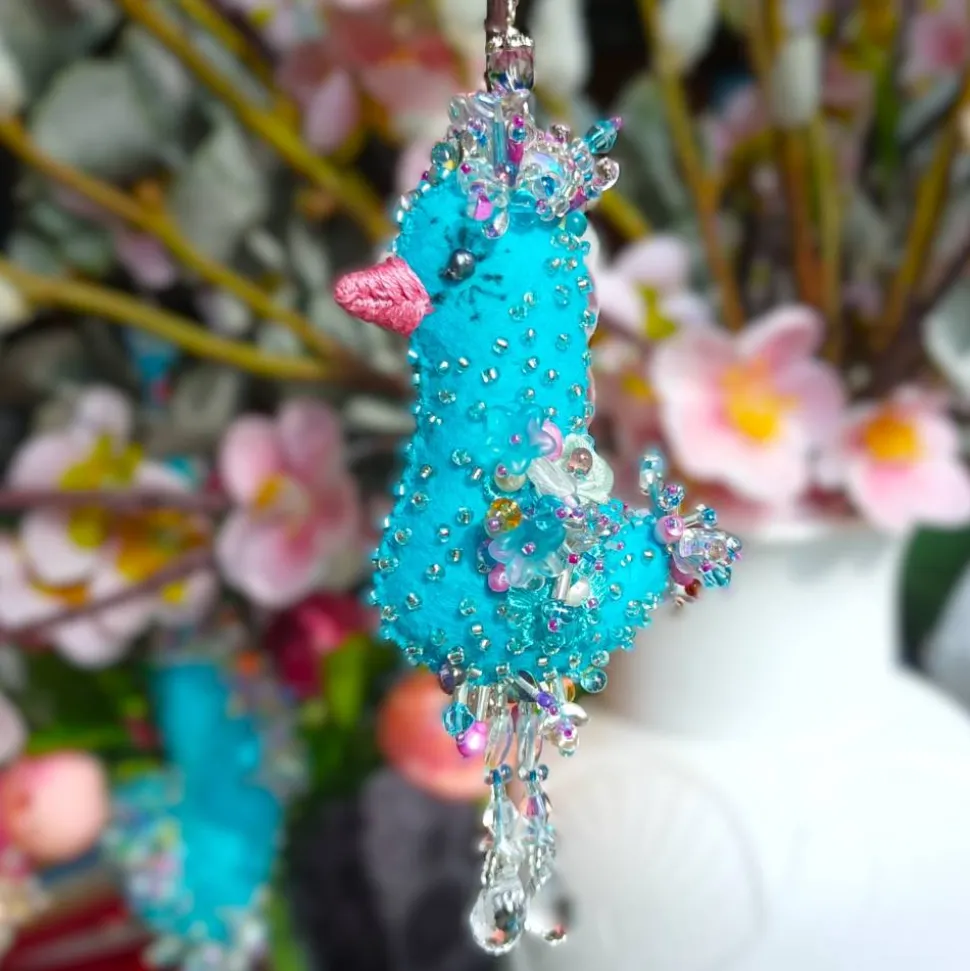 Die Maße: Höhe etwa 9 Zentimeter, Breite 6 cm, Stärke ca. 2 cm, Gesamtlänge mit Kettchen 21 cm. Das perlenbestickte Ornament funkelt auch bei wenig Licht und ist ein hochwertiger Blickfang für Naturtöne und Aquafarben. Mit diesem in Deutschland handgefertigten Unikat wird dein Blumenstrauß im Sonnenlicht oder bei Kerzenlicht zum luxuriösen Hingucker.