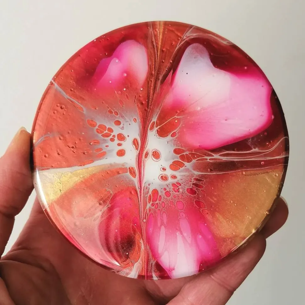 Dieses individuelle Vorratsglas ist mit einem hochwertigen, von Hand bemalten Holzdeckel in Magenta, Kupfer und Gold ausgestattet. Jedes Stück ist ein Unikat, mit Acrylbildern veredelt, die auf den Deckel gegossen und mit Kunstharz beschichtet werden. Dadurch ist die Oberfläche abwischbar und besonders langlebig.