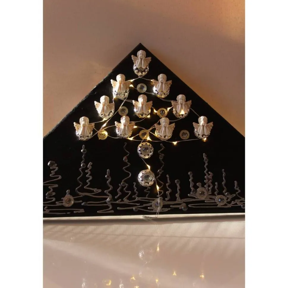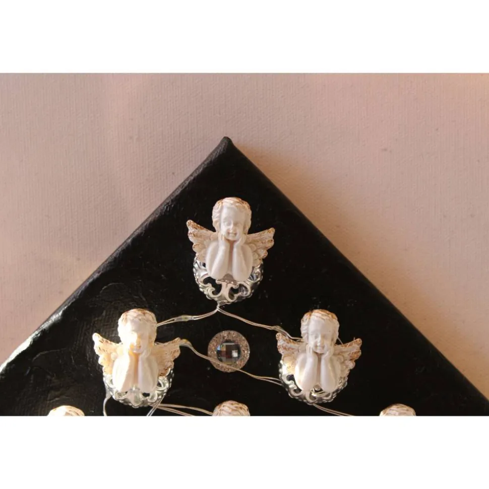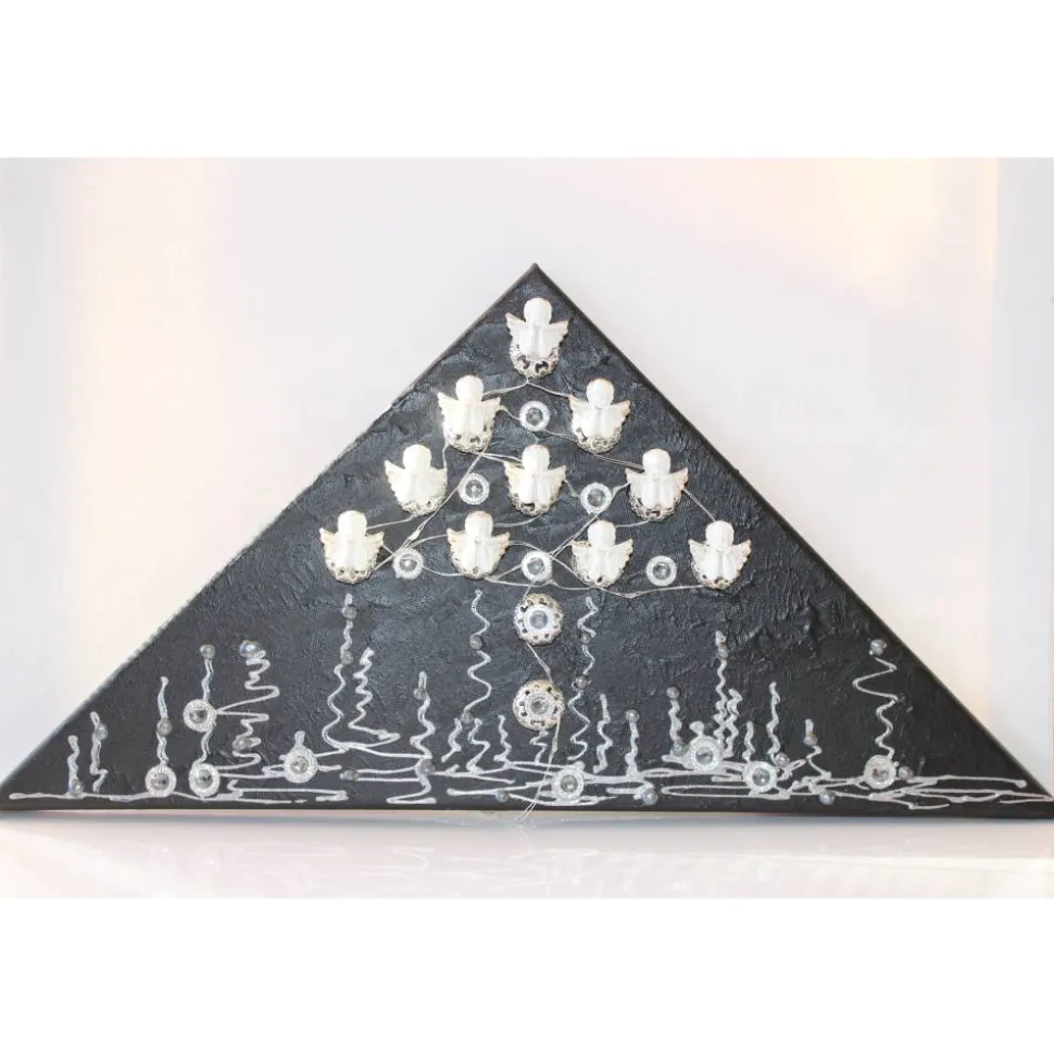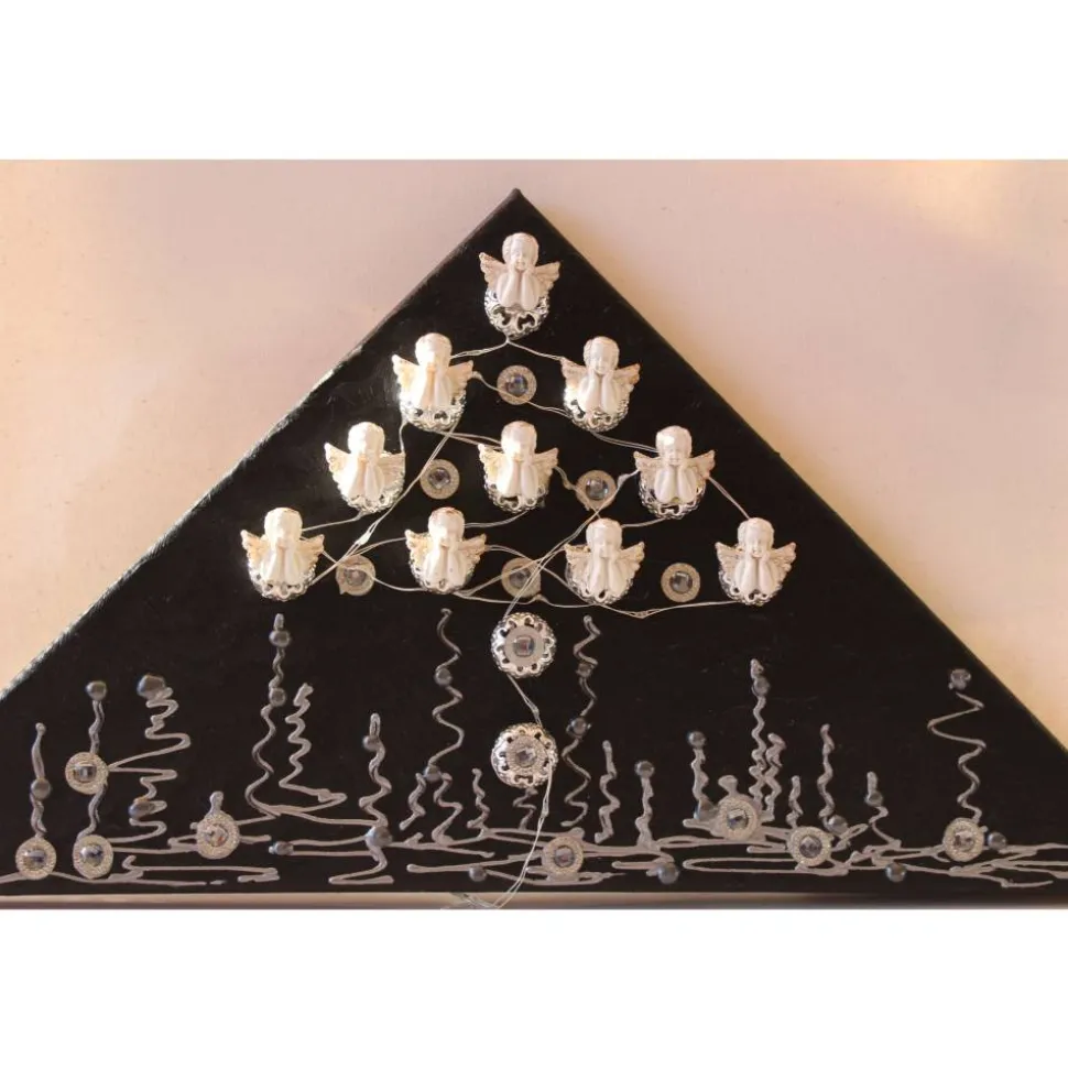 Bei diesem Modell handelt es sich um ein mit Engeln gestaltetes Objekt. Die Verzierung besteht aus kleinen Glitzersteinen und Metallkügelchen. Die Leinwand ist mit Acrylfarben gestaltet.