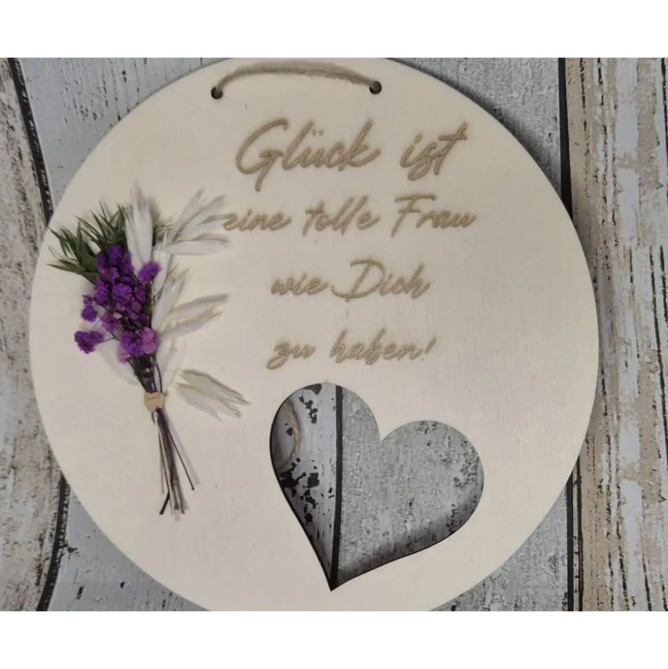 Gestalte deinen Wunschtext, der per Lasergravur auf das Schild gebracht wird, und mache dein Geschenk zu einem ganz persönlichen Highlight. Das ausgeschnittene Herz verleiht dem Holzschild einen besonderen Charme und setzt einen stilvollen Akzent.