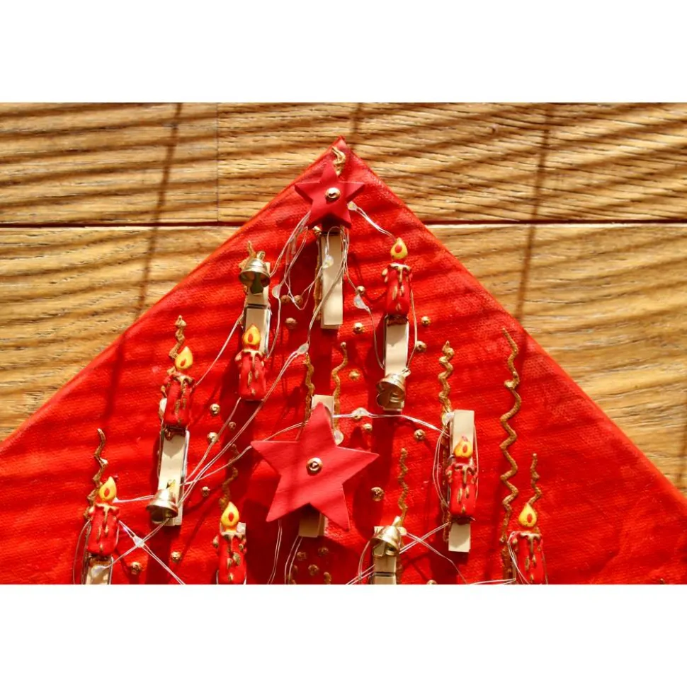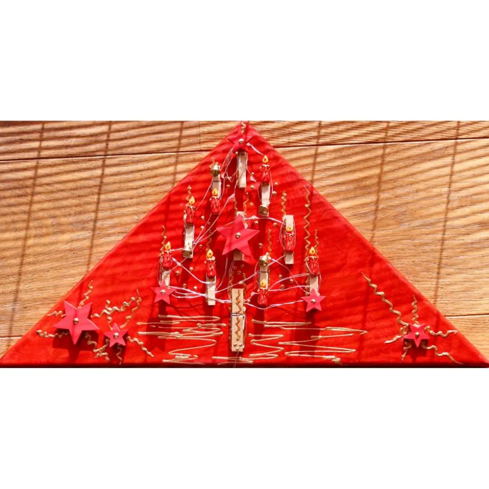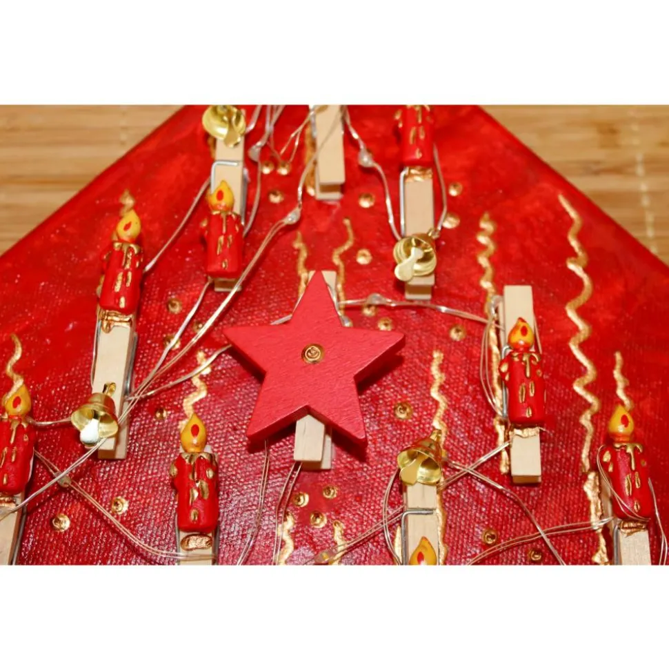 Bei diesem Modell „Klammerbäumchen“ handelt es sich um ein mit kleinen Klammern gestaltetes Objekt. Die Verzierung besteht aus kleinen Glöckchen, Kerzen aus Kunststoff, Holzsternen und Acrylfarben. Die Leinwand ist mit Acrylfarben gestaltet.