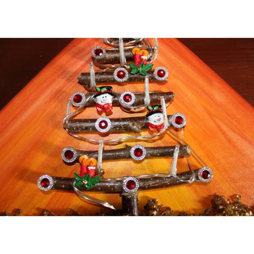 Bei diesem Modell „Schneemann-Baum“ handelt es sich um ein mit Holz gestaltetes Objekt. Die Verzierung besteht aus kleinen Schneemännern und Kerzen aus Kunststoff und Glitzersteinen. Die Leinwand ist mit Acrylfarben gestaltet.