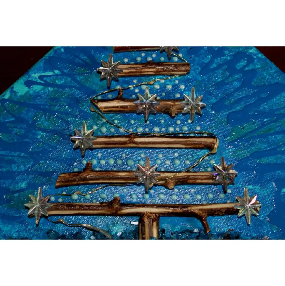 Bei diesem Modell „Sternenbaum“ handelt es sich um ein mit Holz, Glassteinen und Sternen gestaltetes Objekt. Die Leinwand ist mit Acrylfarben gestaltet.