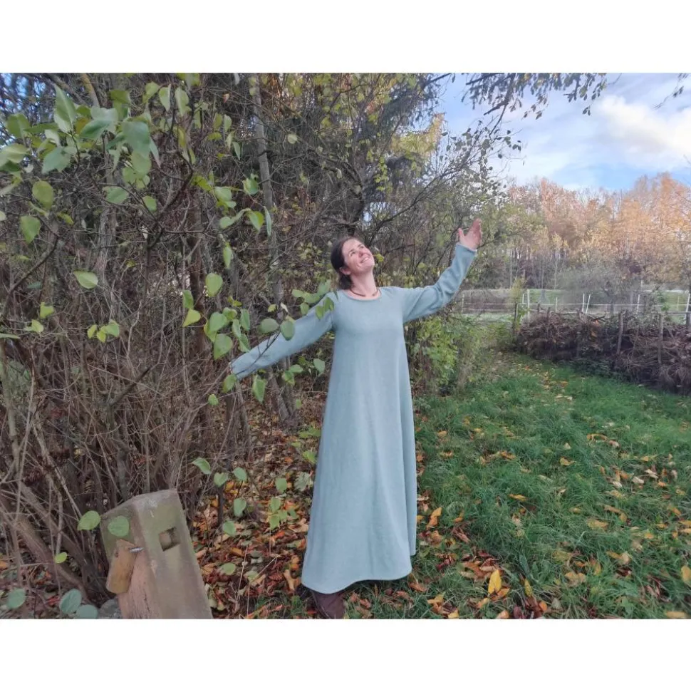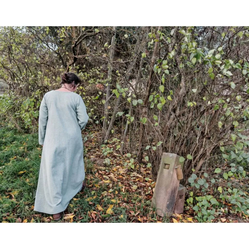 Wunderschönes, warmes Winter Wikinger Kleid aus dickem Wollstoff in salbei und wollweiß – perfekt für kalte Wintertage. Angenehm zu tragendes, weiches Wohlfühlkleidungsstück.