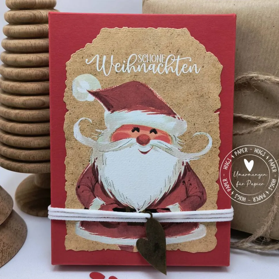 ◈ Handliche A6 Geschenkschachtel mit Wunscherfüllungsfunktion. Sie benötigen keine zusätzliche Verpackung, der Geschenk Karton ist ein Augenschmaus & Handschmeichler und wird Groß oder Klein erfreuen. Die Karte außen ist mit süßem handgemaltem Weihnachtsmann aus schwerem Aquarellpapier mit fast lederartiger Haptik im Etiketten Format mit Büttenrand Stil.