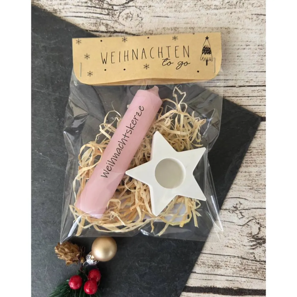Das Tütchen enthält ein Stabkerze samt passendem Stern-Kerzenhalter und ist liebevoll verpackt.