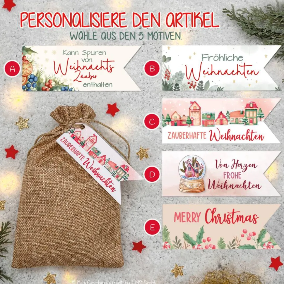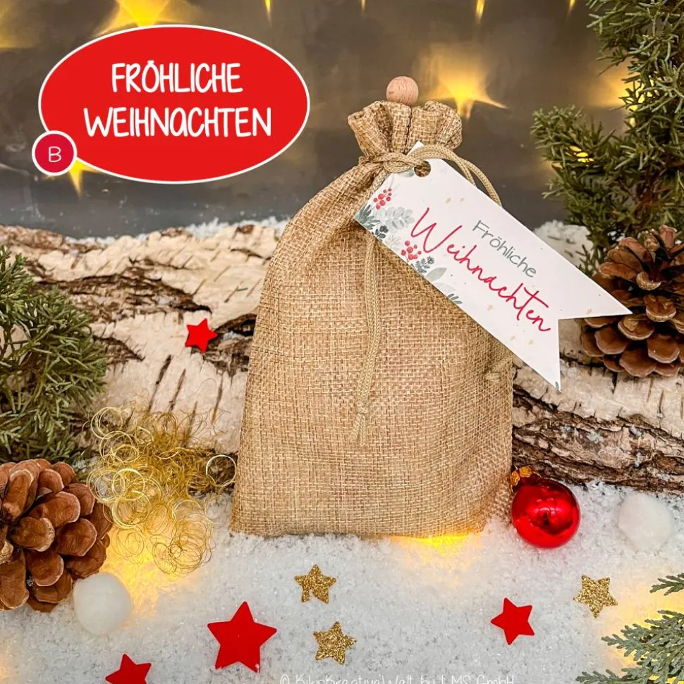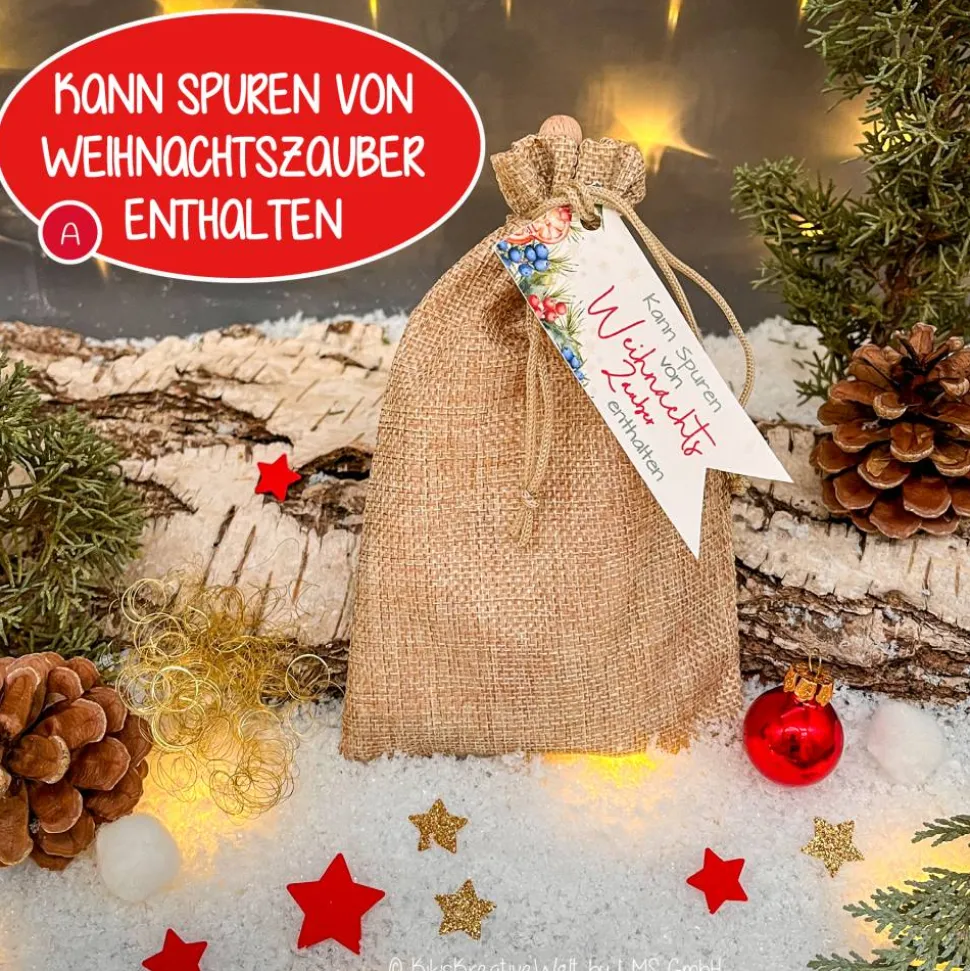 Der Jutebeutel (18×11 cm) ist befüllt mit weihnachtlichen Kleinigkeiten: