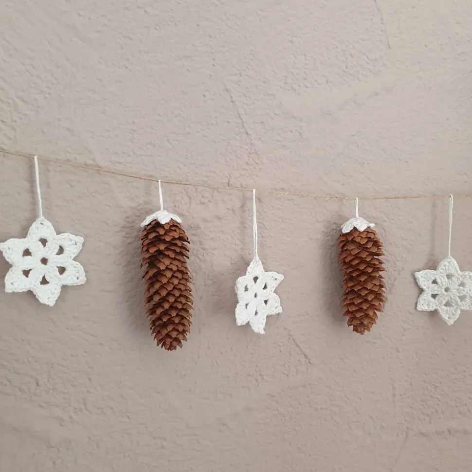 Bringe mit dieser handgefertigten Girlande winterlichen Charme in Deine vier Wände! Die Kombination aus liebevoll gehäkelten Sternen aus 100 % Baumwolle und echten Fichtenzapfen macht diese rustikale Wanddeko zum Highlight Deiner weihnachtlichen Dekoration.