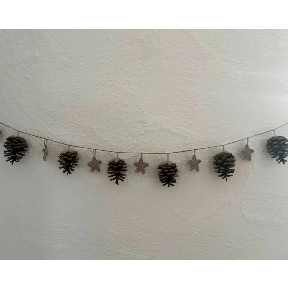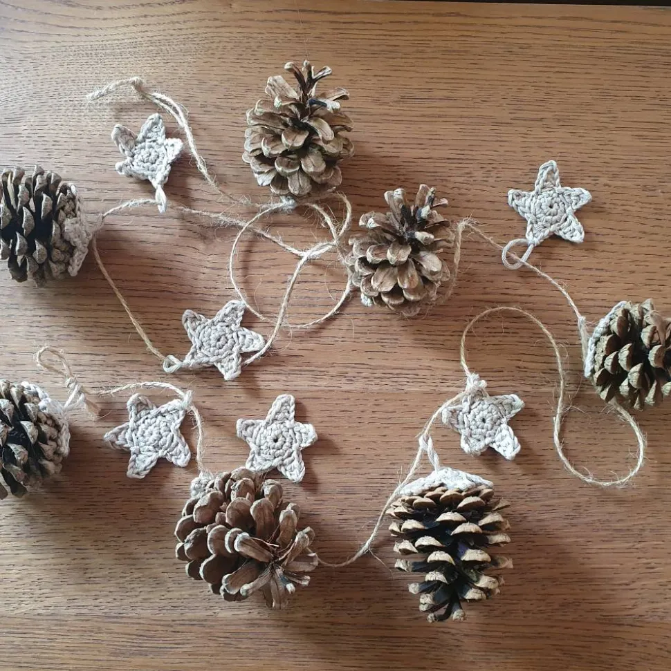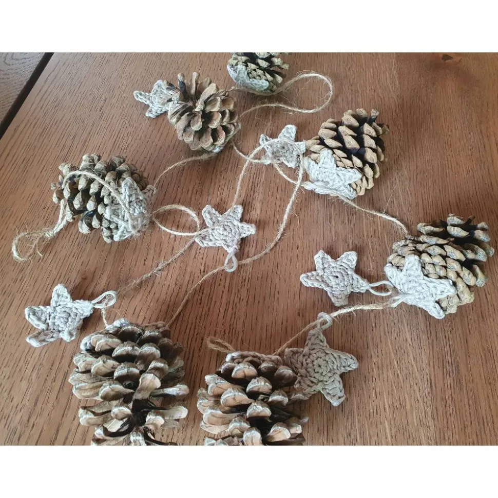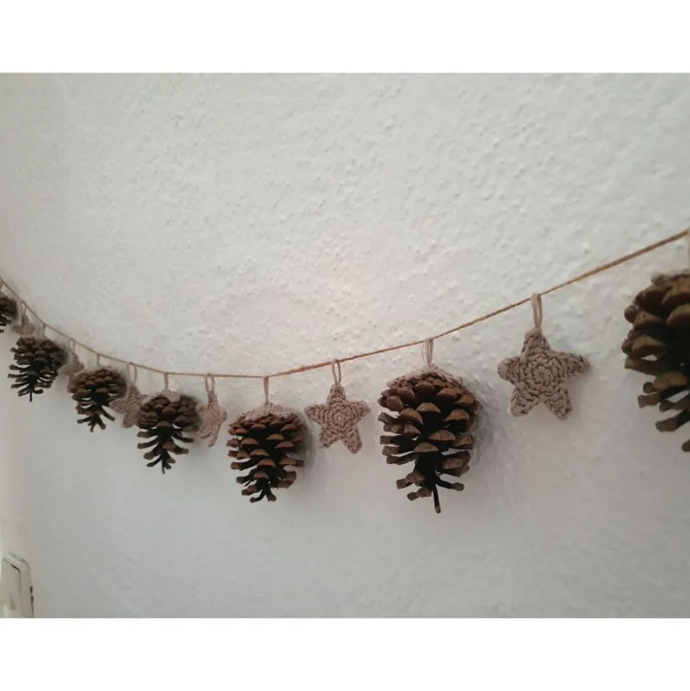 Diese handgefertigte Girlande aus natürlichen Kieferzapfen und gehäkelten Sternen bringt eine festliche, warme Atmosphäre in dein Zuhause. Die naturverbundene Deko im skandinavischen Hygge-Stil lädt dich ein, die Gemütlichkeit des Winters voll zu genießen.