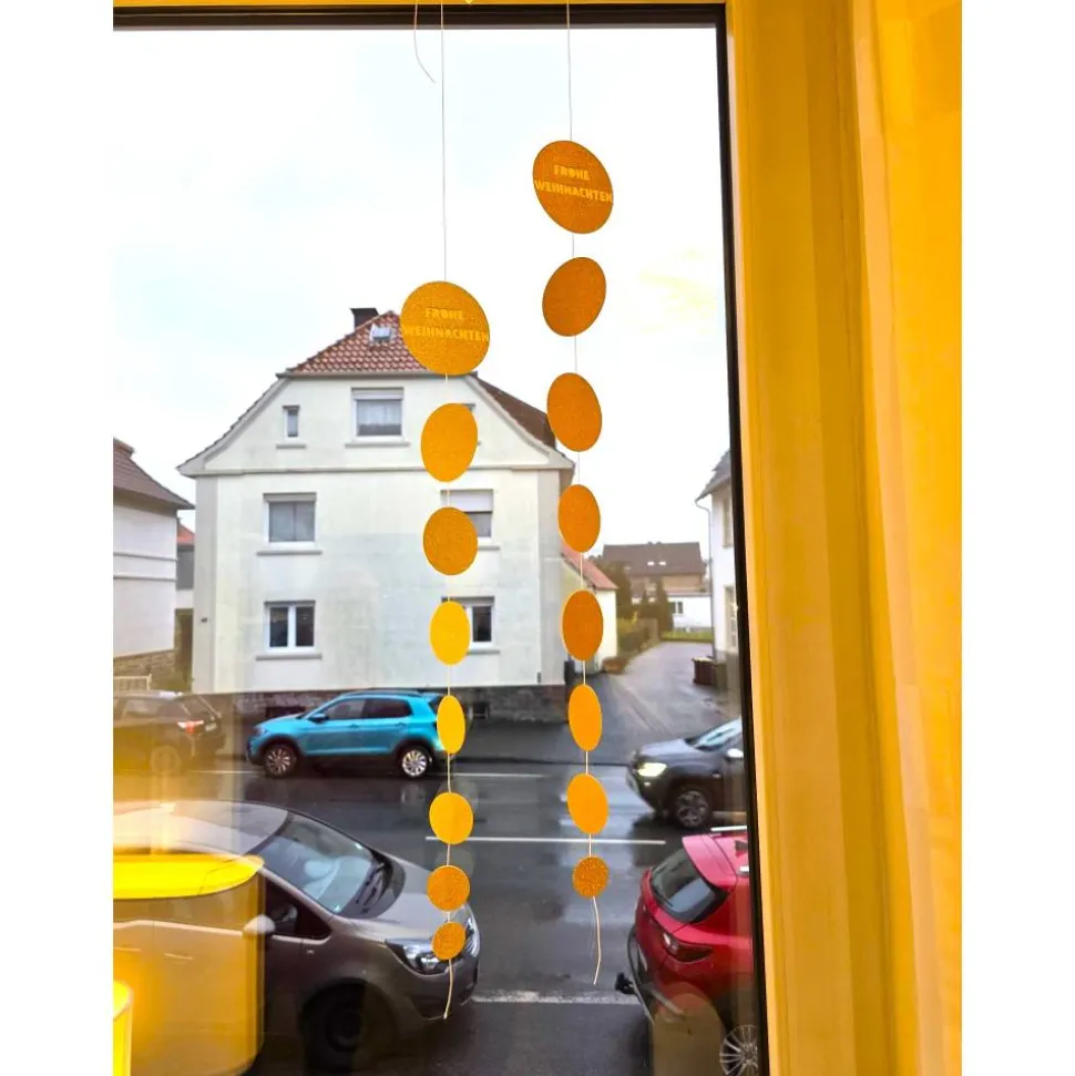 Der oberste Kreis trägt die festliche Botschaft ,, Frohe Weihnachten´´ in weißer Schrift, während die übrigen sieben kreise in funkelndem Gold schimmern – schlicht, edel und perfekt für Türen, Fenster oder Wände.