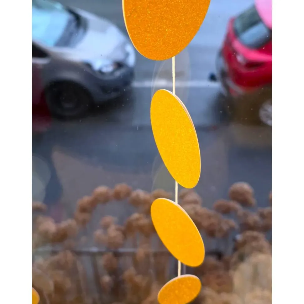 Glitzernde Weihnachtsdekoration – ,, Frohe Weihnachten´´ Anhänger. Ein Eleganter Blickfang für die festliche Jahreszeit. Diese vertikale Hängedekoration besteht aus acht sorgfältig ausgeschnittenen Kreisen aus hochwertigem 250 GSM Glitzerpapier, doppelt verklebt für extra Stabilität und ein luxuriöses Finish.