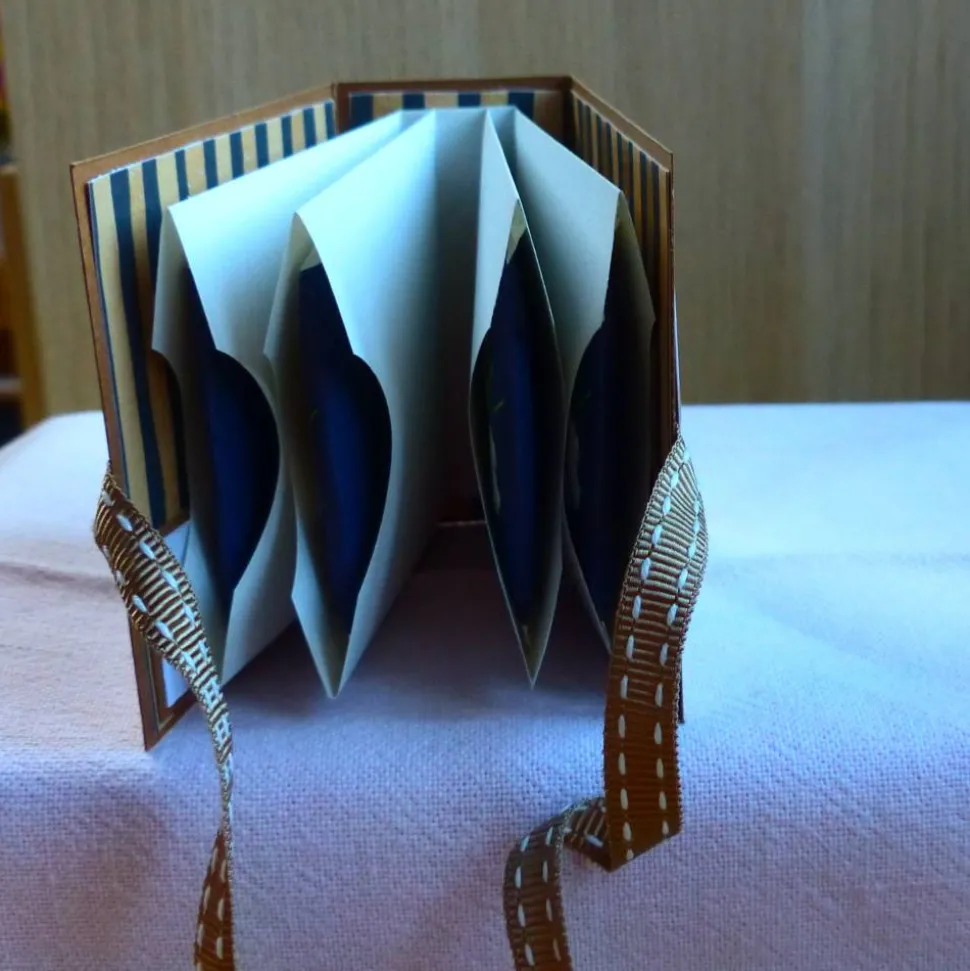Gefertigt ist dieses Buch aus Karton.Ein hübsches Satinband ist zum Verschließen angebracht.