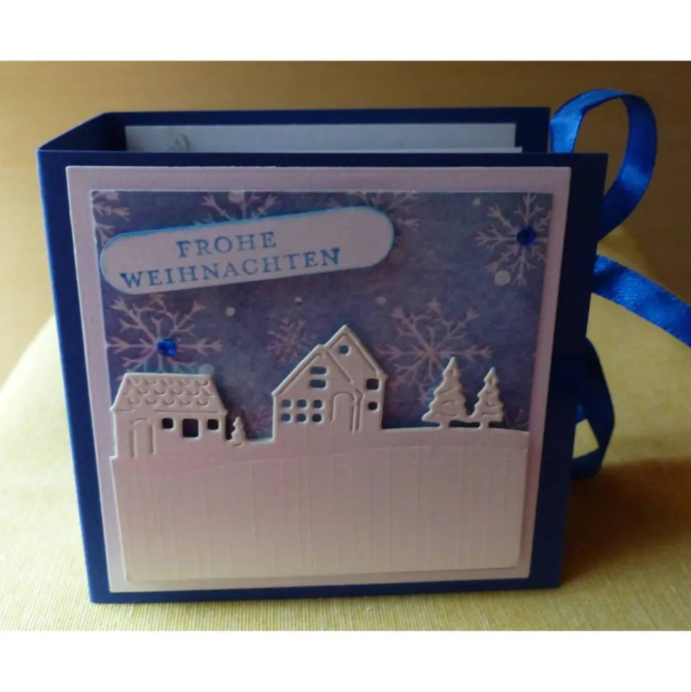 Das Büchlein ist aus dunkelblauen Farbkarton mit einem weien Papier und bedruckten Motivkarton gearbeitet.