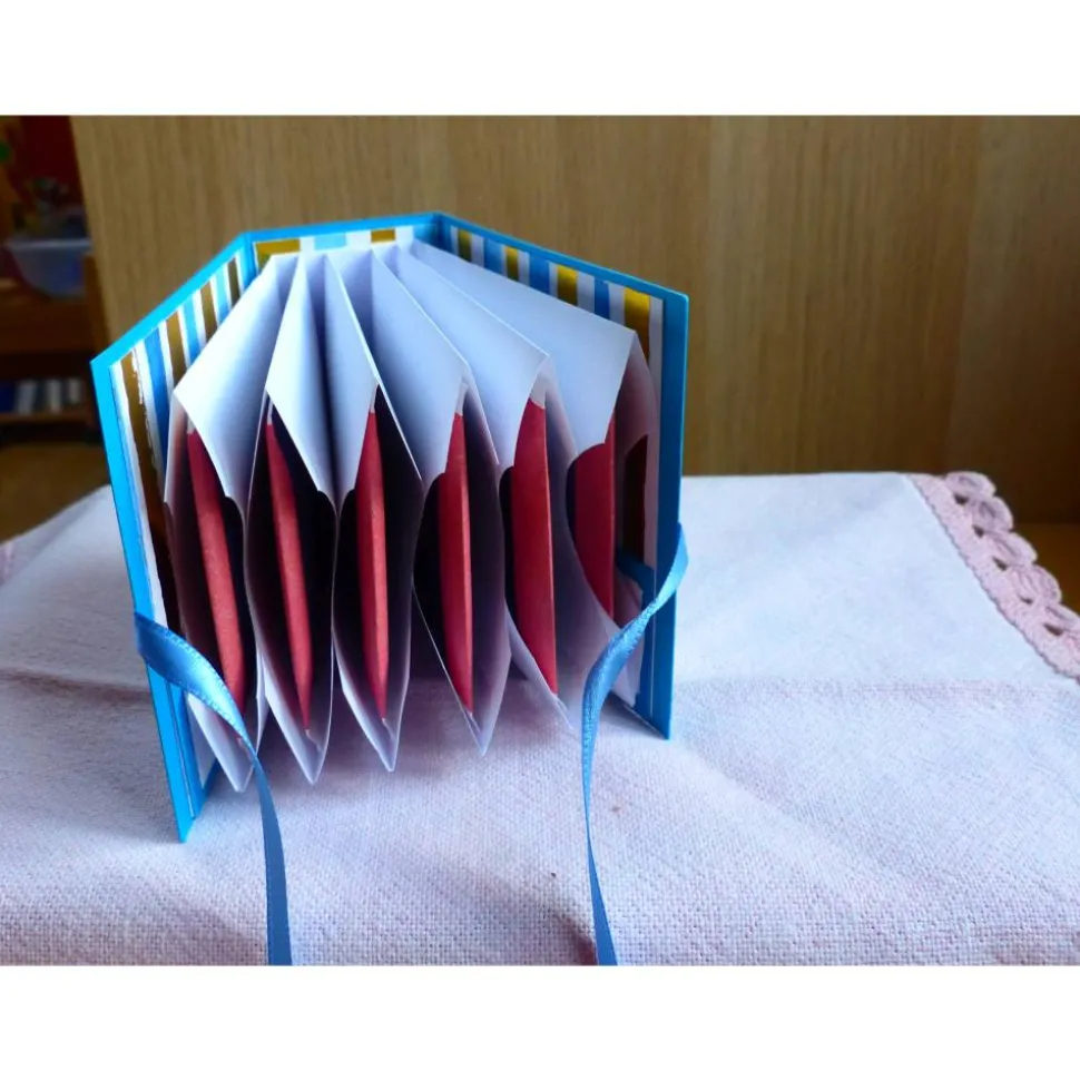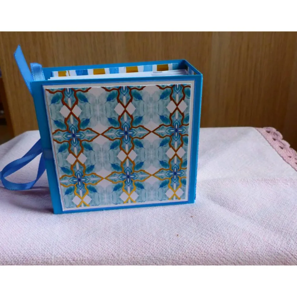 Das Büchlein ist aus türkiblauen Farbkarton mit einem weien Papier und bedruckten Motivkarton gearbeitet.