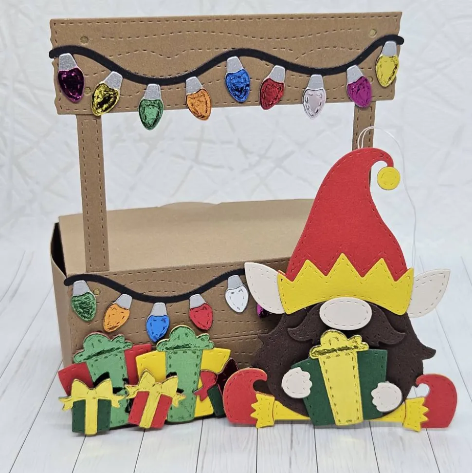 Die Buden-Front: Festlich beleuchtet: Die dekorative Front ist im Stil eines kleinen Weihnachtsmarktstandes oder einer Gabenhütte gestaltet. Sie ist mit einer wunderschönen, ausgestanzten Lichterkette verziert, deren bunte „Glühbirnen“ aus metallisch glänzendem und farbigem Karton bestehen. Diese detailreiche Gestaltung (Gesamtfront ca. 13 cm hoch und 10 cm breit) erzeugt sofort eine warme, festliche Atmosphäre.