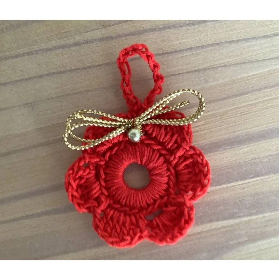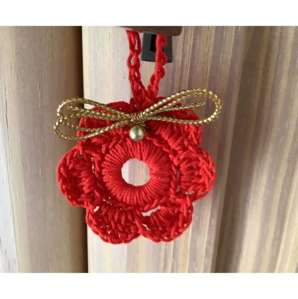 Das weihnachtliche rote Häkel-Kränzchen mit Aufhänger-Schlaufe ist mit 1 goldfarbenen Perle und einer goldfarbenen Schleife dekoriert. Die runde Perle und die Schleife sind angenäht.