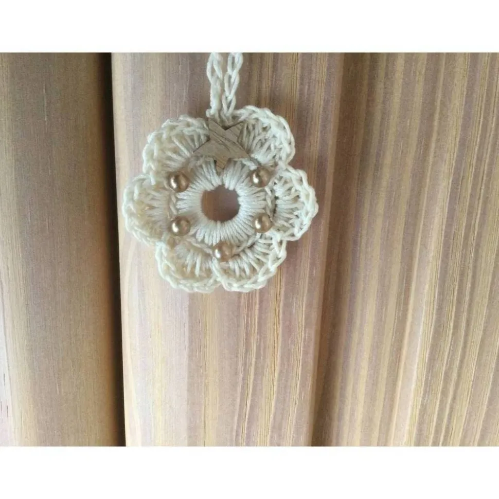 Das beige, weihnachtliche Häkel-Kränzchen mit Aufhänger-Schlaufe ist mit 5 braunen Wachs-Perlen und einem kleinen Holz-Sternchen dekoriert. Die runden braunen Perlen sind angenäht und das kleine Holz-Sternchen ist angeklebt.
