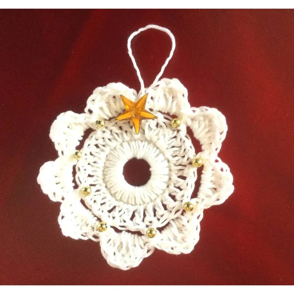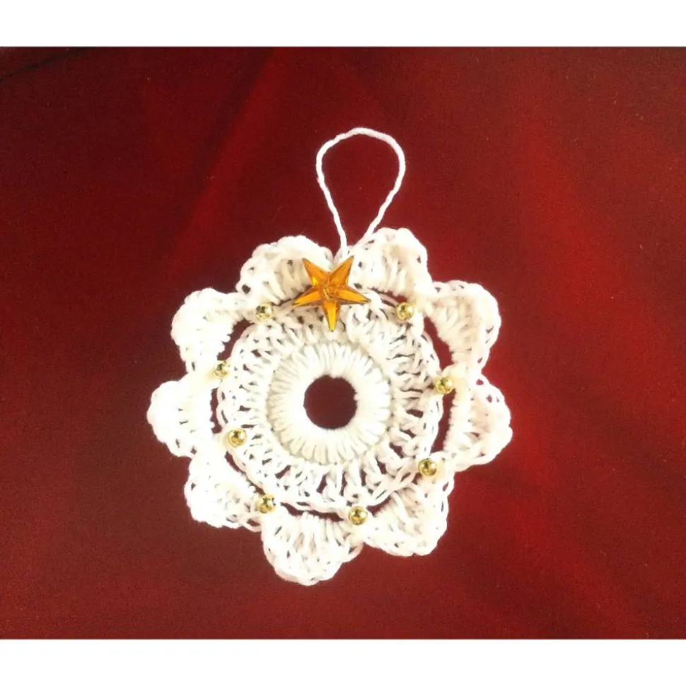 Das weihnachtliche Häkel-Kränzchen mit Aufhänger-Schlaufe ist mit 8 goldfarbenen Perlen und einem goldfarbenen Sternchen dekoriert. Die runden Perlen und das kleine Sternchen sind angenäht.