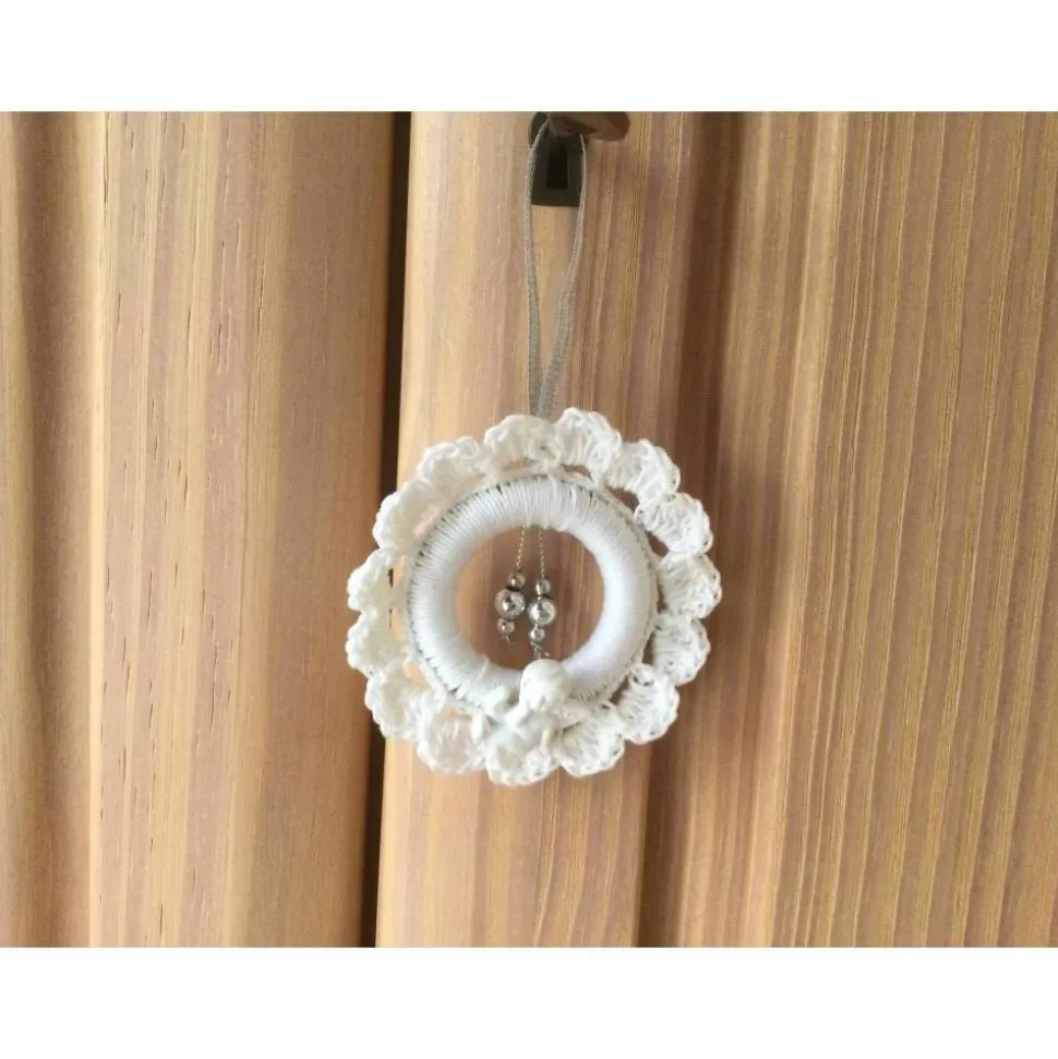 Das weihnachtliche Häkel-Kränzchen mit einer silberfarbenen Aufhänger-Schlaufe ist über einen Holzring von hand gehäkelt. Mit einem weißen Engelchen ist das weihnachtliche Kränzchen dekoriert. Im inneren Ring ist das Kränzchen mit zwei silbernen Perlensträngen verziert.