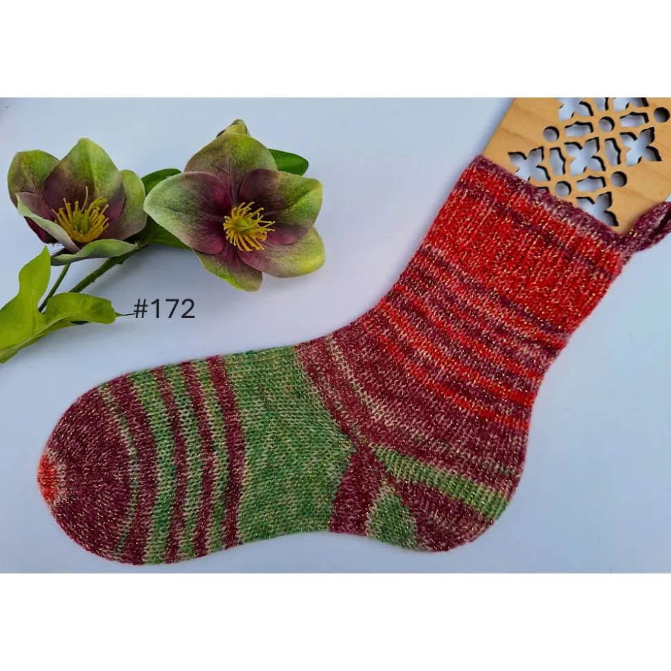 Farben: wählbar wie abgebildet – rot, natur und grün gemustert – ein zarter Glitzerfaden durchzieht den Strumpf