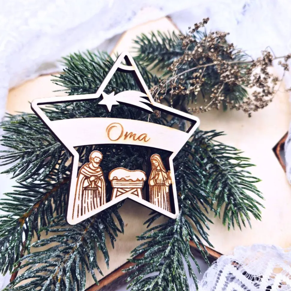 Der personalisierte Holzstern mit Namen wird aus 4 mm naturfarbenen Pappelsperrholz gefertigt und mittels Laser geschnitten und graviert.