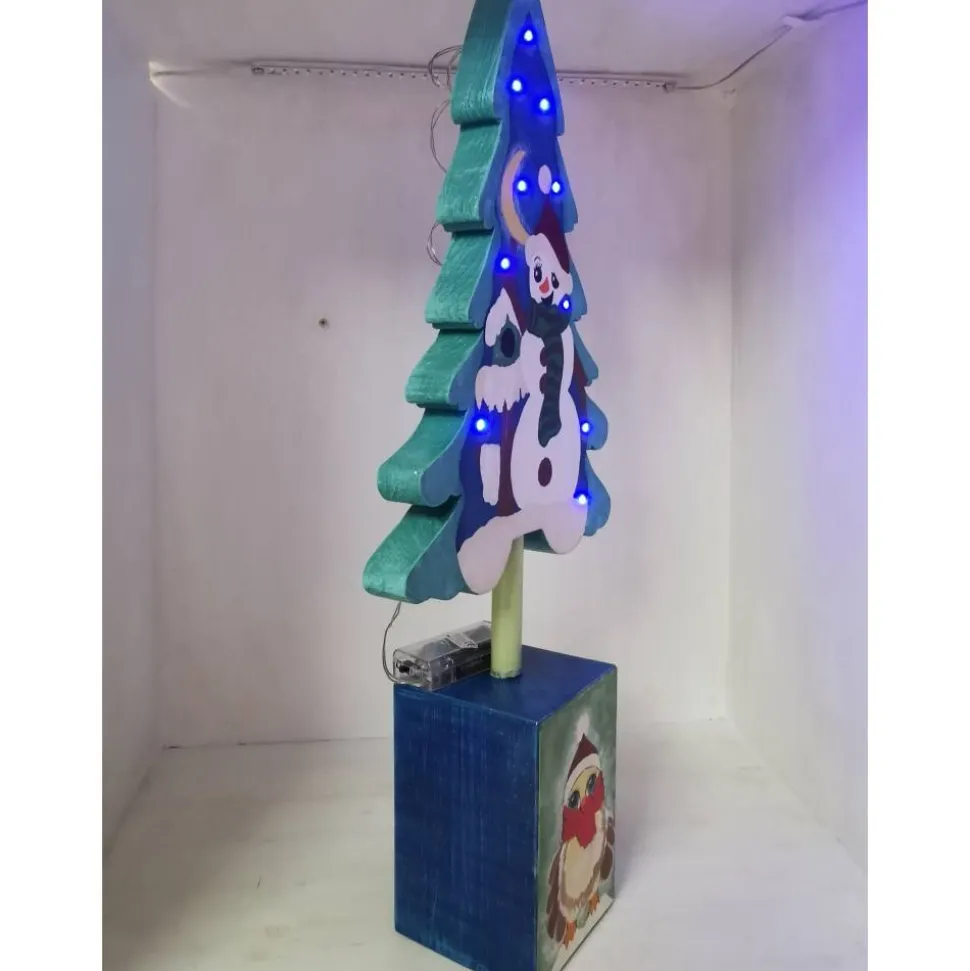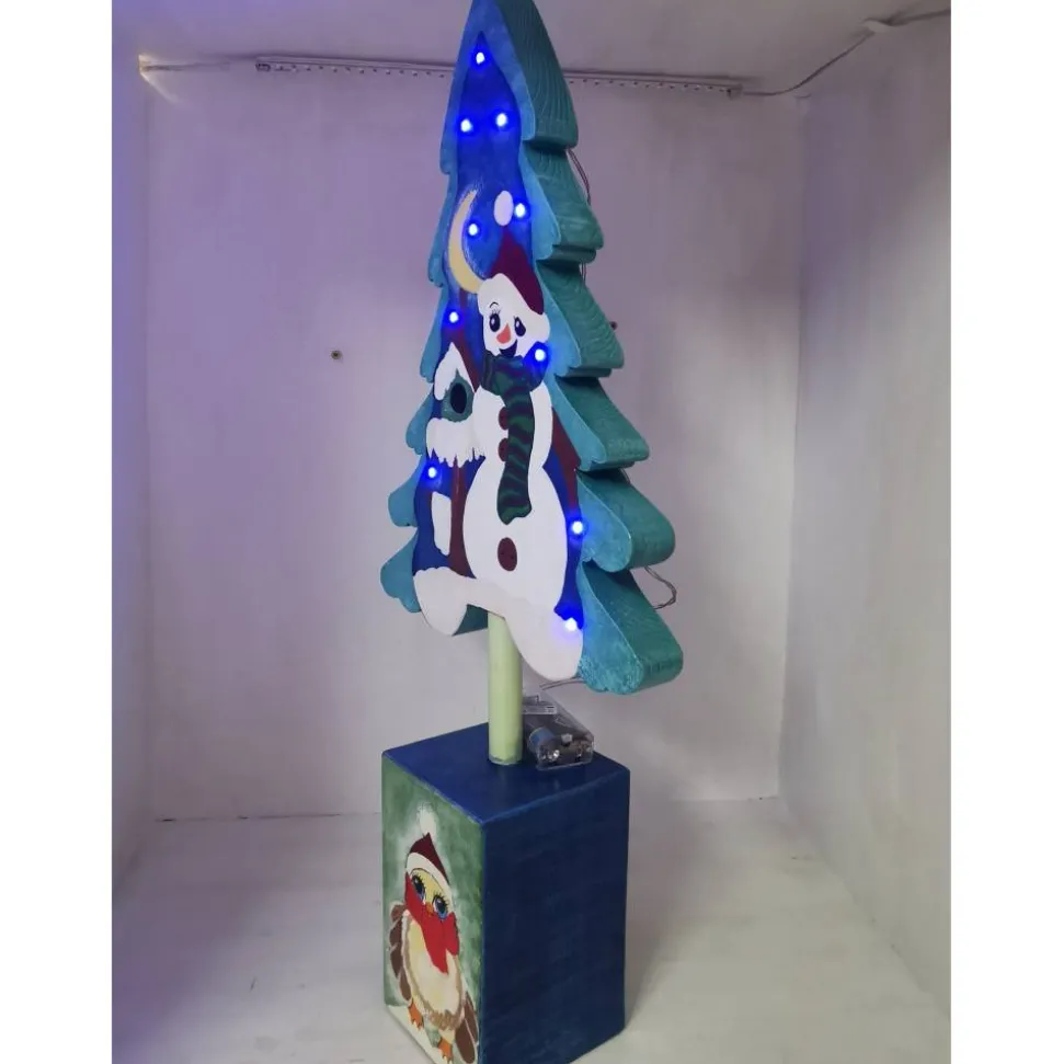 Der Weihnachtsbaum ist aus 28mm Leimholz gefertigt, bemalt mit ganz viel Liebe zum Detail, das VK Holz ist 10x10cm, auch sehr aufwendig bemalt, verwendet hab ich dafür Acrylfarben und abschließend zweimal wetterfest versiegelt. Er kann draussen stehen, die Lichterkette ist natürlich im Lieferumfang enthalten. Das Ganze ist ca 55cm hoch und 23cm breit, macht sich also sehr gut im Eingangsbereich oder auch an grossen Fenster.