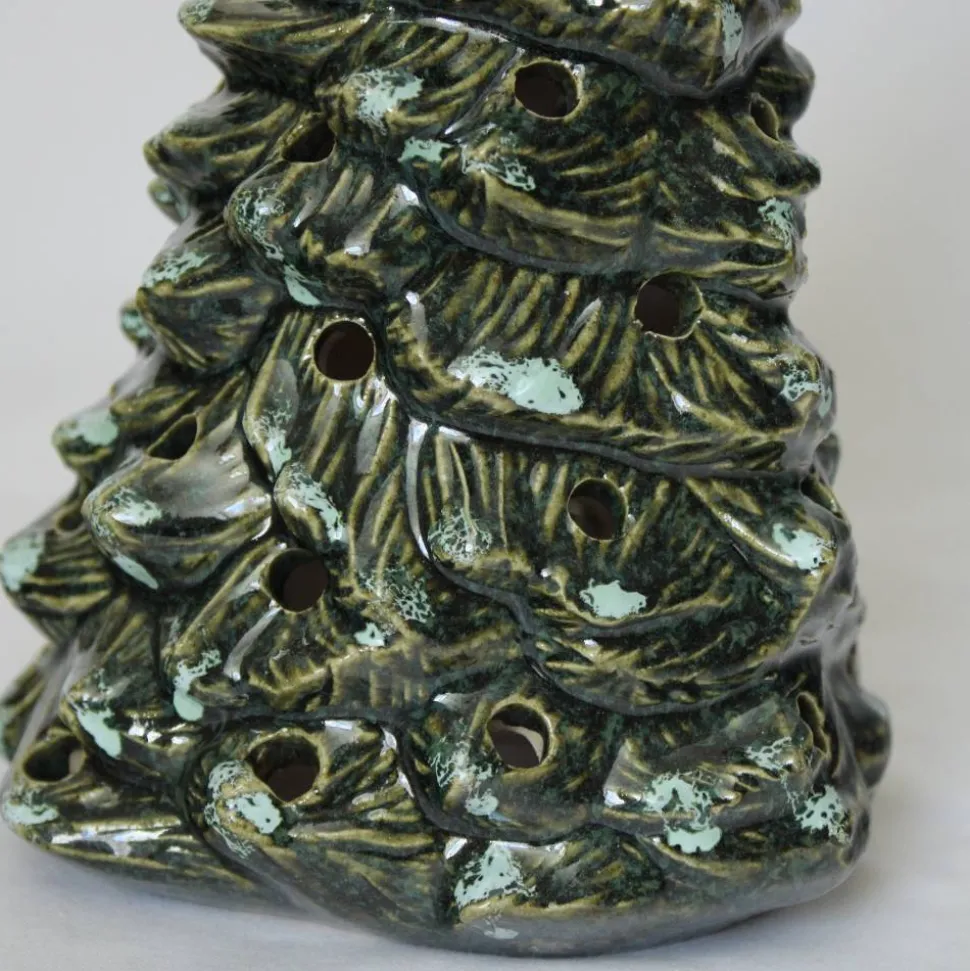Dieser handgefertigte Weihnachtsbaum aus Keramik ist ein einzigartiges Dekorationsstück, welches deine Weihnachtsdekoration um eine nostalgische und gemütliche Note bereichert. Der Baum ist 20cm hoch und unten zwischen 10 und 12cm breit. Der Weihnachtsbaum wurde mit hochwertigen Glasuren glasiert, was ihm eine besondere Wertigkeit verleiht. Hierfür wurde eine Effektglasur verwendet und zusätzlich Schneeeffekte aufgetragen. Er ist sehr detailreich gearbeitet und verfügt über kleine Lichtöffnungen durch welche ein sehr stimmungsvolles Licht entsteht. Der Weihnachtsbaum ist für den Betrieb mit einer Lichterkette bzw. Teelicht vorgesehen. Es wird die Verwendung einer kleinen Lichterkette empfohlen. Mit dieser wird das schönste Leuchtbild erzielt. Hierfür ist zur Kabelführung extra eine Öffnung an der Unterseite des Baumes eingearbeitet.