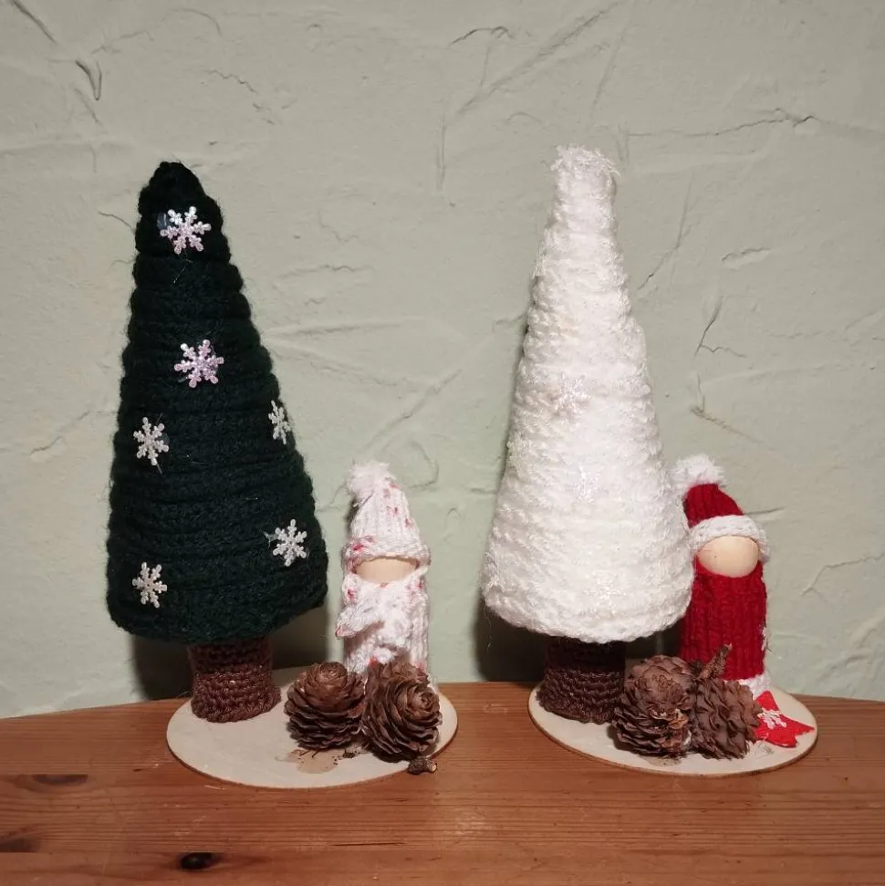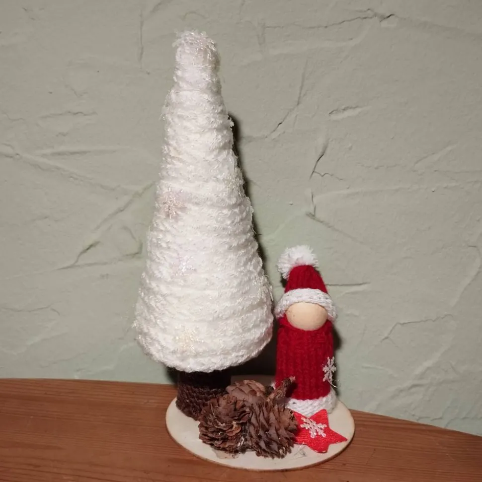 Eine lange Kordel, gefertigt mit der altbekannten Strickliesel, wurde sorgfältig um einen Styroporkegel geklebt. Der „Stamm“ besteht aus einem umhäkelten Korken, der für einen besonderen natürlichen Charme sorgt. Das kleine Holzpüppchen trägt ein gestricktes Mäntelchen sowie eine passende Mütze und macht die Szene besonders niedlich.