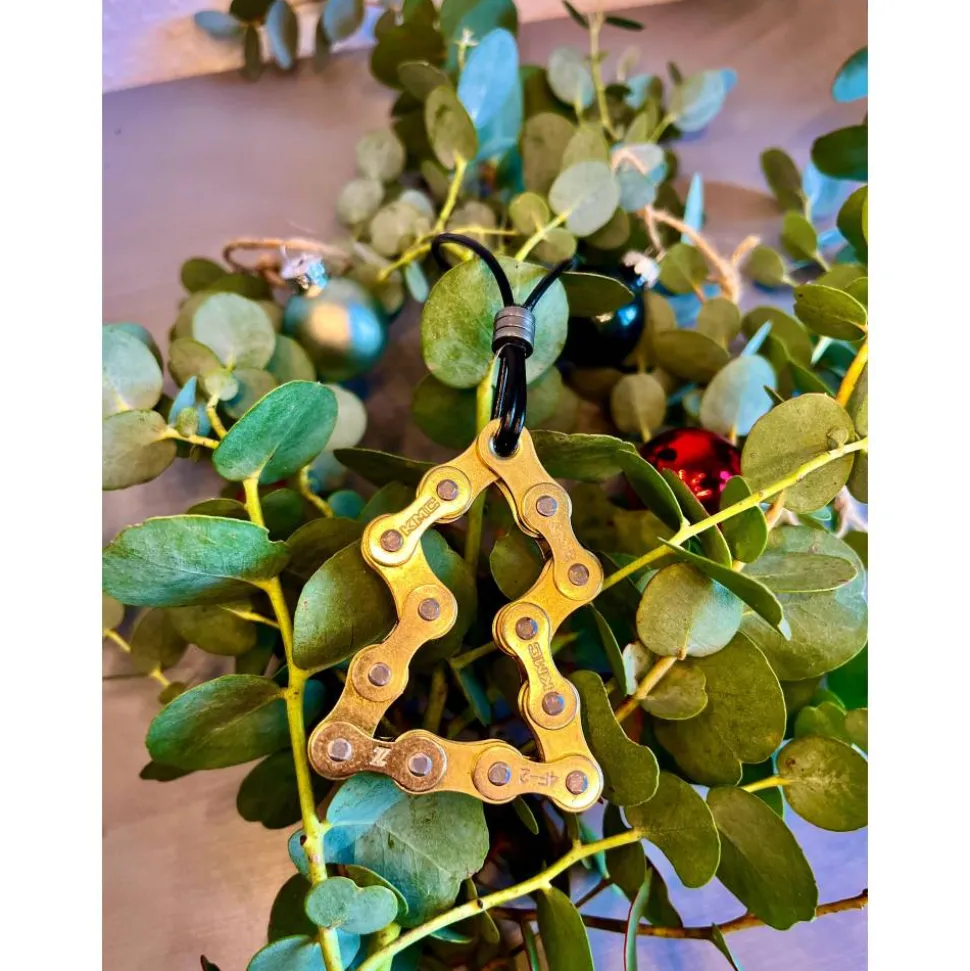Die Glieder der Fahrradkette werden sorgfältig gereinigt, geformt und in eine stilvolle Form gebracht. Das robuste Metall und der industrielle, schlichte Look sorgen für einen spannenden Kontrast zu klassischer Weihnachtsdekoration und machen diesen Anhänger zu einem echten Blickfang – perfekt für moderne, minimalistische oder kreative Weihnachtsbäume.