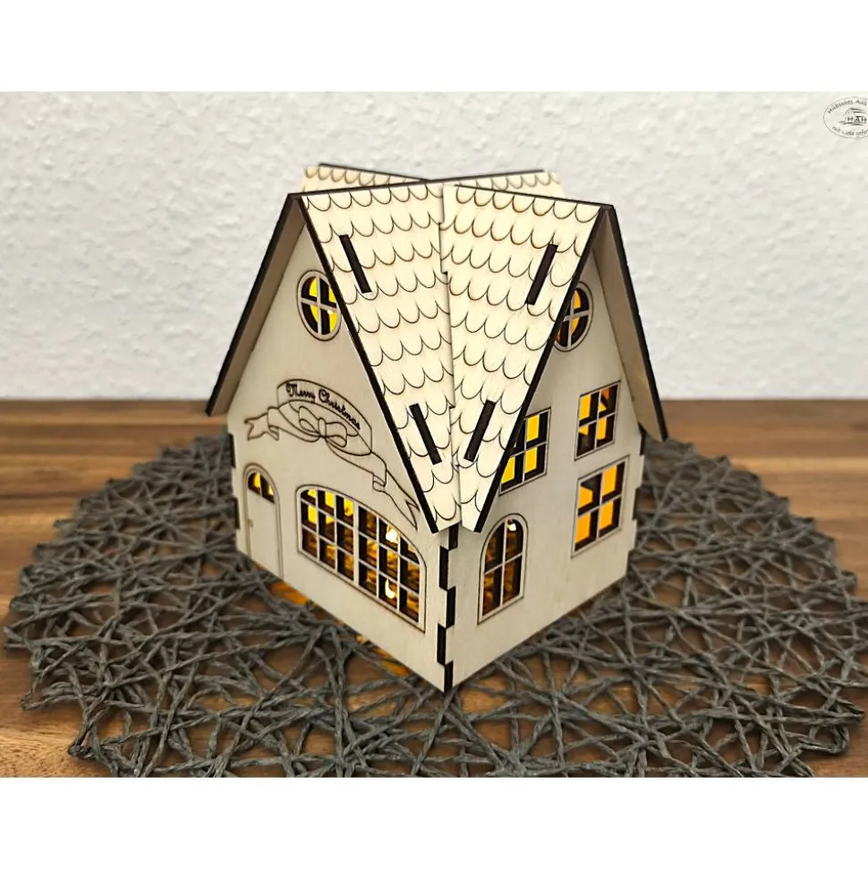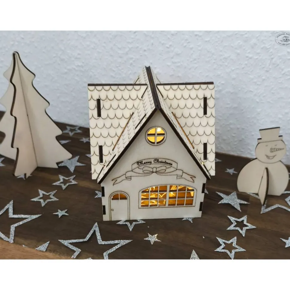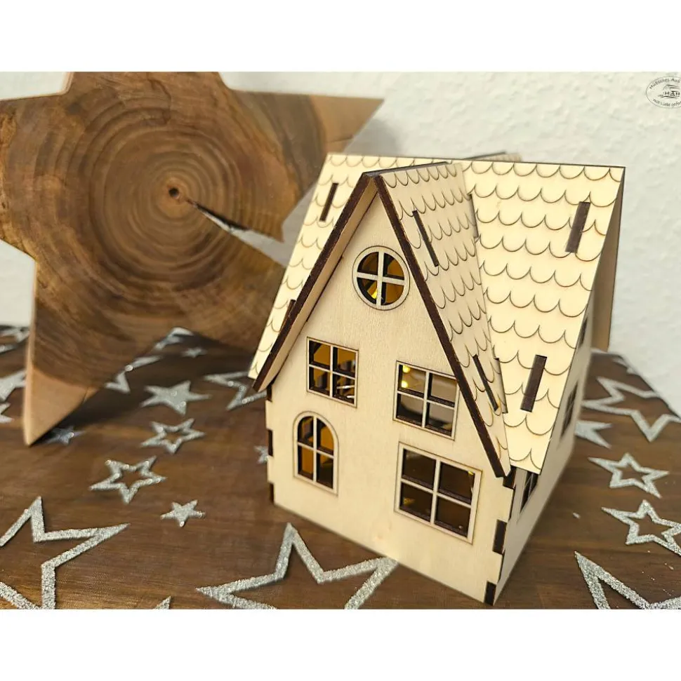 Dieses liebevoll gestaltete Weihnachtshaus aus Pappelsperrholz ist ein Bastelset für Groß und Klein mit filigranen Details.