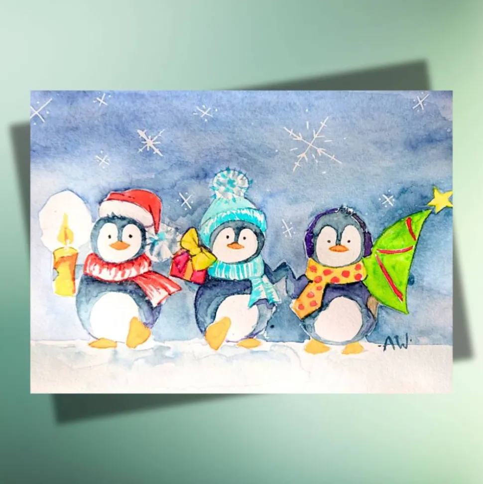 Weihnachtskarte Drei kleine Pinguine – Handillustrierte Aquarellkarte auf Kraftpapier