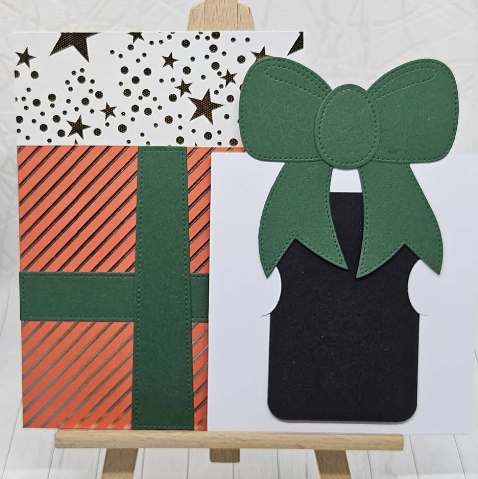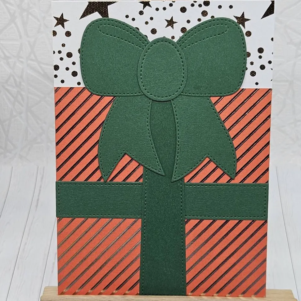 Der Mittelpunkt der Gestaltung ist die präzise gearbeitete tannengrüne Schleife, die farblich bewusst einen starken, weihnachtlichen Akzent setzt. Sie verleiht der Karte Tiefe, Struktur und einen klassischen Geschenk-Look, der gleichzeitig verspielt und edel wirkt. Über dem Geschenkbereich befindet sich ein Abschnitt mit goldenen Sternen und Punkten, der die festliche Optik ergänzt und die Karte zusätzlich aufwertet.