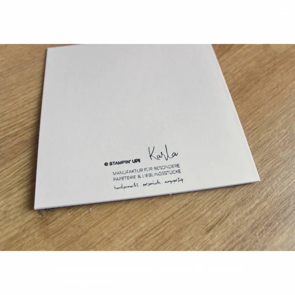 Jede Karte wird sorgfältig von Hand gefertigt, wodurch jedes Exemplar ein Unikat ist. Die Verwendung hochwertiger Materialien garantiert eine hervorragende Qualität. Das Format der Karte bietet ausreichend Platz für persönlichen Worte. Die Karte wird zusammen mit einem passenden Umschlag geliefert.