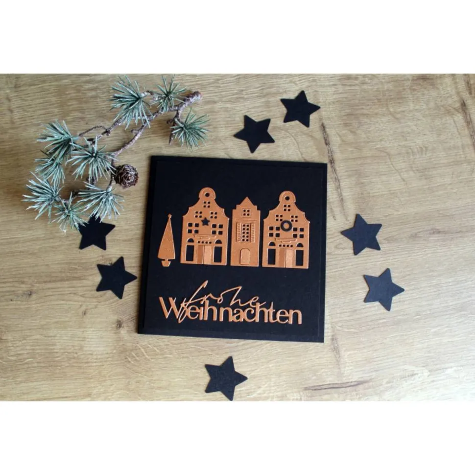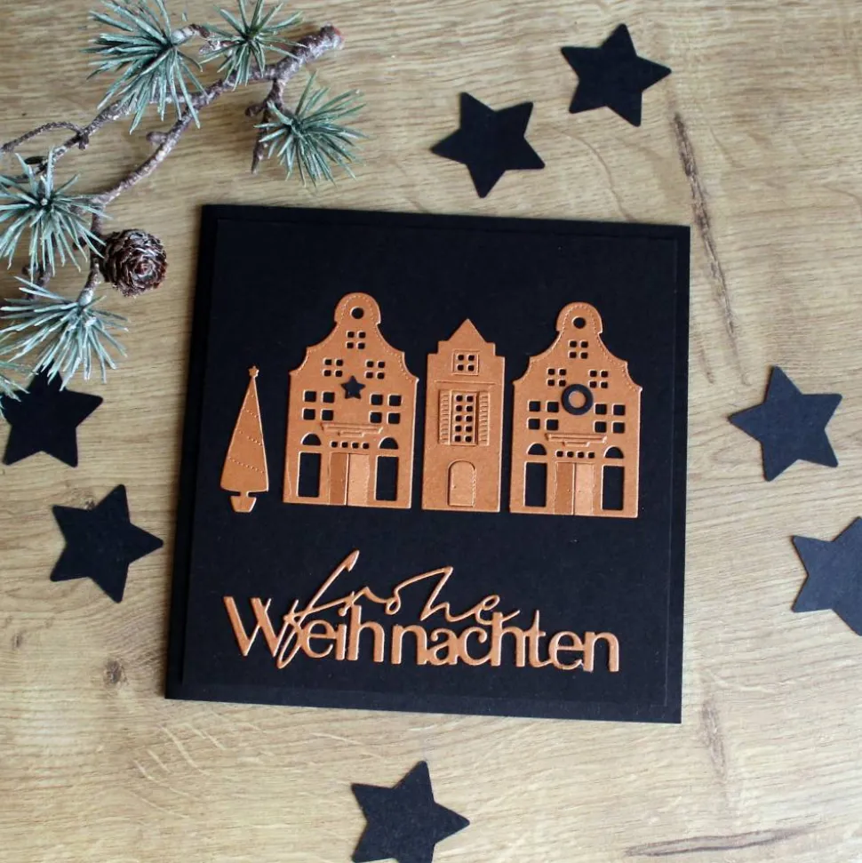 Die quadratische, schwarze Grußkarte ist mit kupfer-schimmernden, gestanzten Grachtenhäuser im weihnachtlichen Look und dem Schriftzug „frohe Weihnachten“ verziert. Kleine Details, wie die leicht geöffneten Türen und die aufgebrachten Fensterläden und Giebel machen die Weihnachtskarte sehr edel.