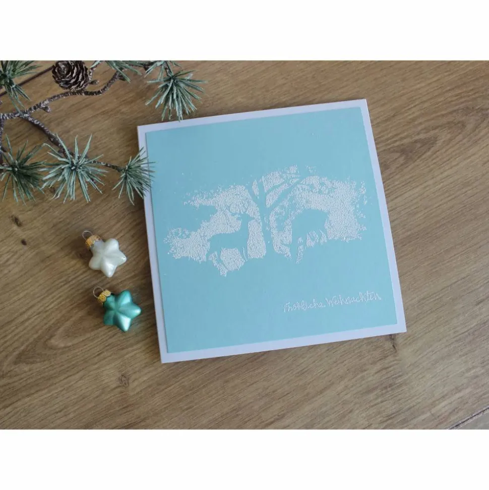 Jede Karte ist ein handgemachtes Unikat und weist daher farbliche Unterschiede zur dargestellten Karte auf. Die Farbschattierungen reichen von einem zart zu dunklem türkis.