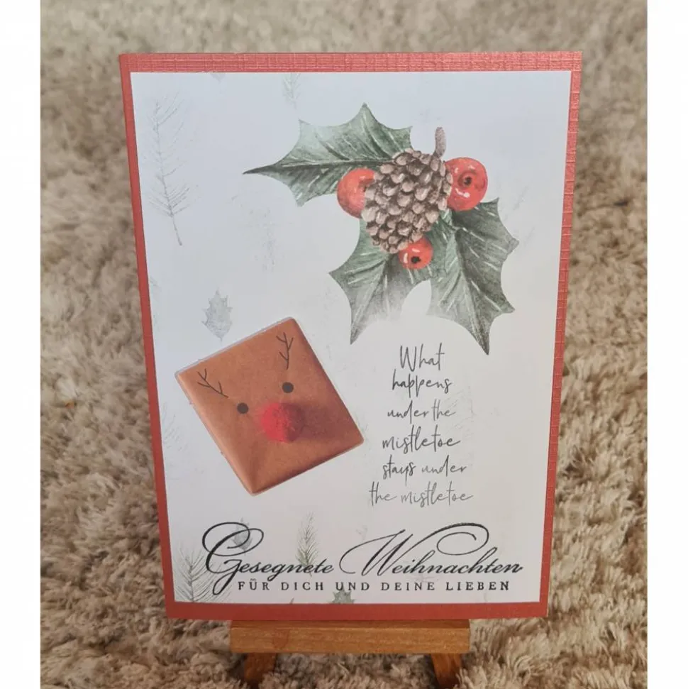 Weihnachtskarte mit Geschenk , Blätter , Tannenzapfen