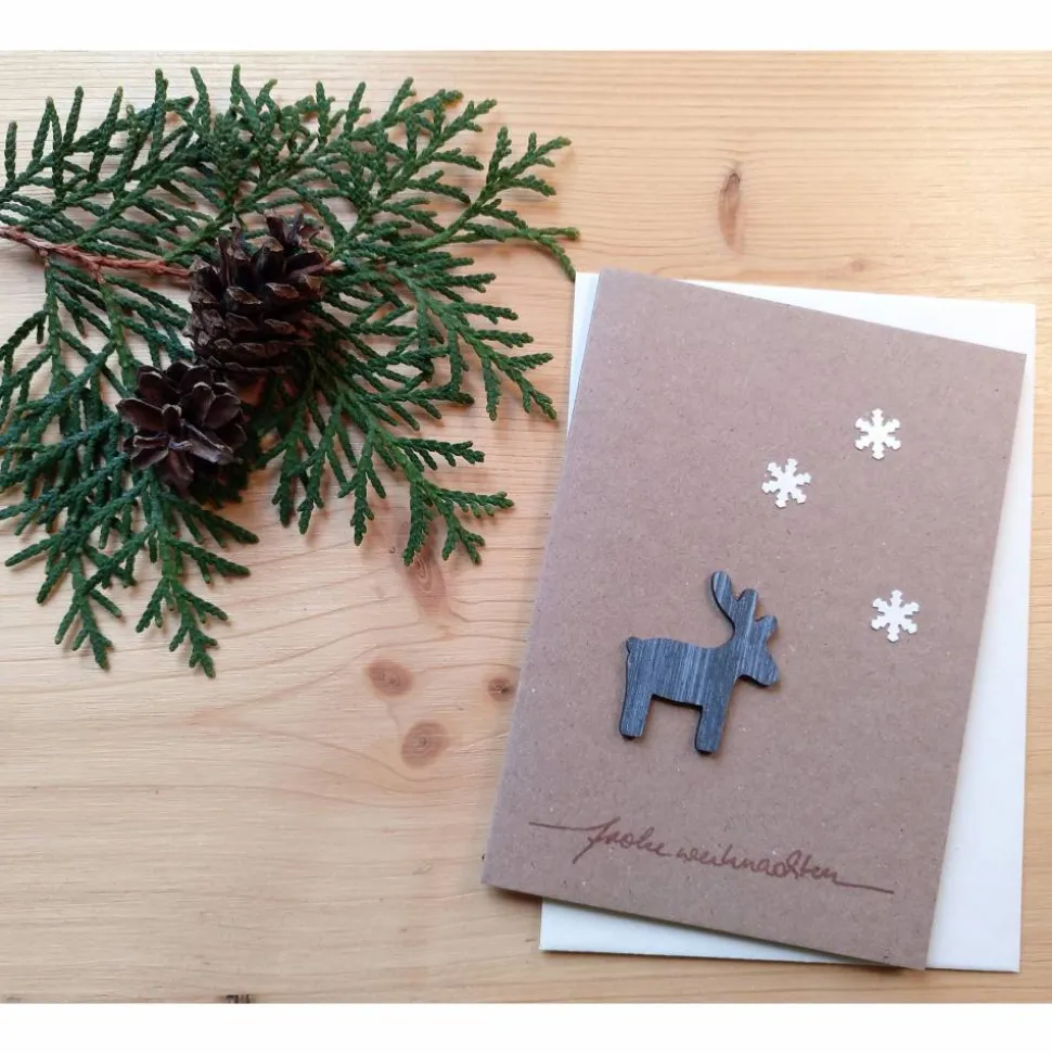 Diese Klappkarte aus Kraftpapier ist mit dem Schriftzug „Frohe Weihnachten“ in bronze-glitzernder Farbe bestempelt, mit einen Rentier aus Holz und drei Schneeflocken aus weiß-glitzerndem Tonkarton beklebt. Die wunderschöne Karte wird durch einen cremefarbenen Umschlag ergänzt.